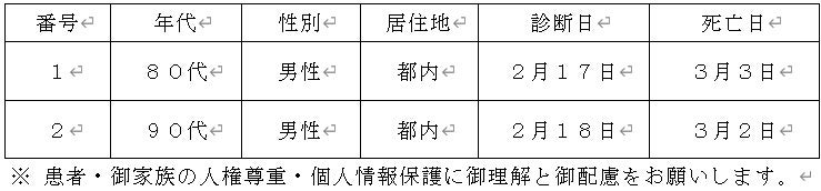 都内で新型コロナウイルスに感染した方が死亡されましたのでお知らせします。