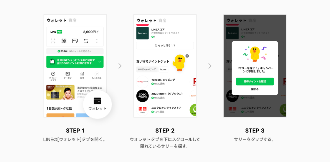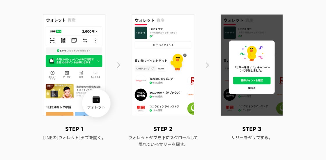 日によって異なる場所に隠れているサリーを探しながら、ぜひ「LINEウォレット」内のサービスをお試し下さい。