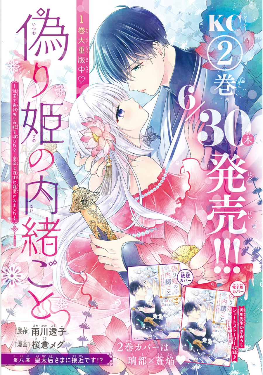 センターカラーで登場するのは、人気が止まらない宮廷ラブロマンス『偽り姫の内緒ごと~後宮で身代わりの妃を演じたら、皇帝と護衛に寵愛されました~』(原作:雨川透子 漫画:桜倉メグ)。