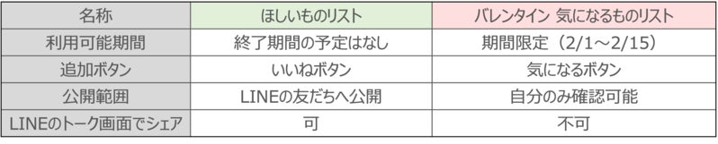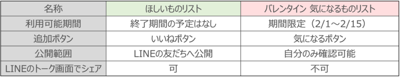 LINEギフトには、自分のほしい商品を登録することができる「ほしいものリスト」があります。「ほしいものリスト」と「バレンタイン 気になるものリスト」の違いは以下になります。
