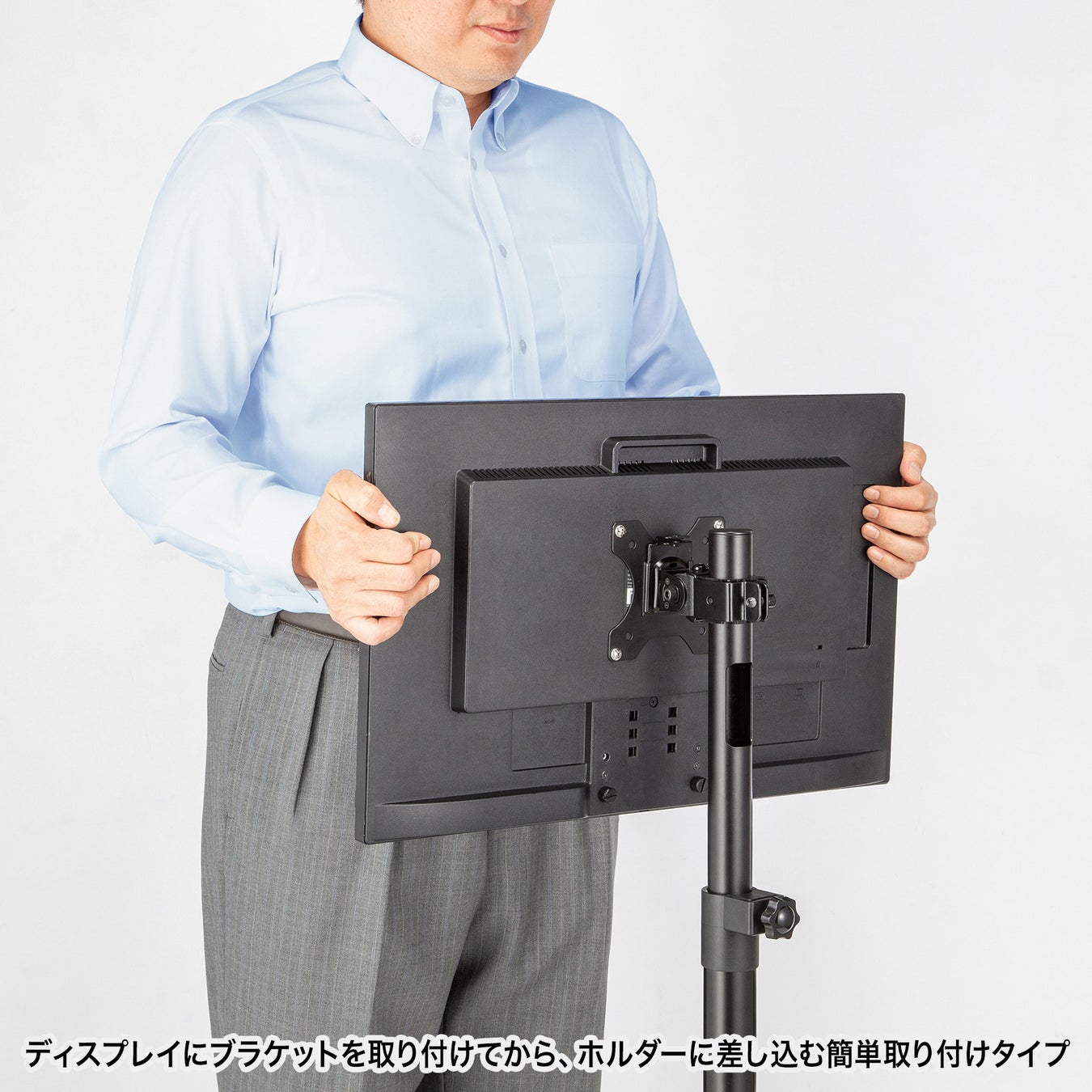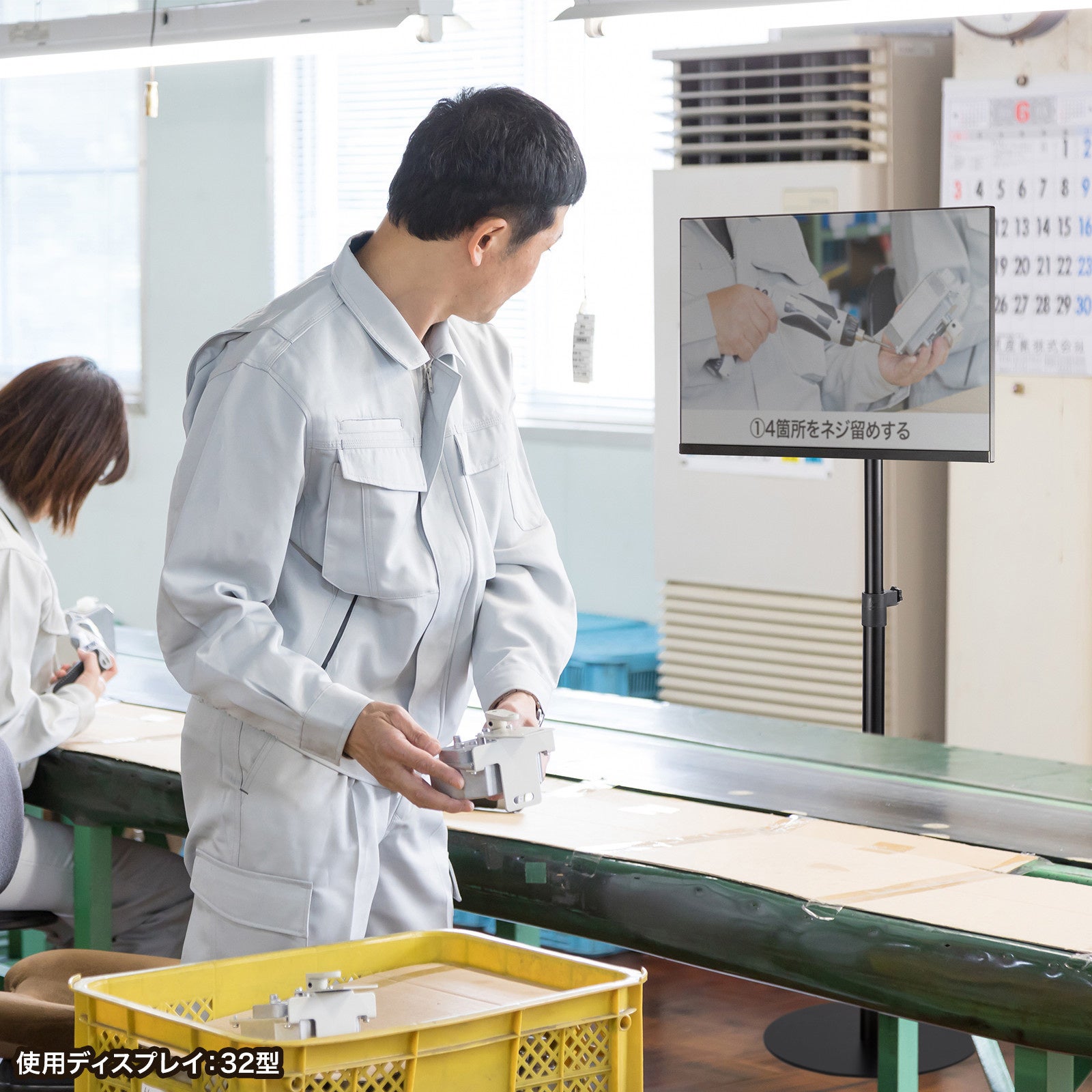 32インチ程度のディスプレイを設置でき、会社の案内板としてや展示会用、病院や工場などのディスプレイ用として使用できます。耐荷重は8kgです。