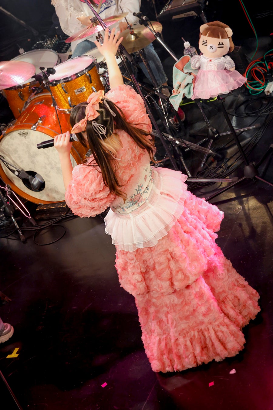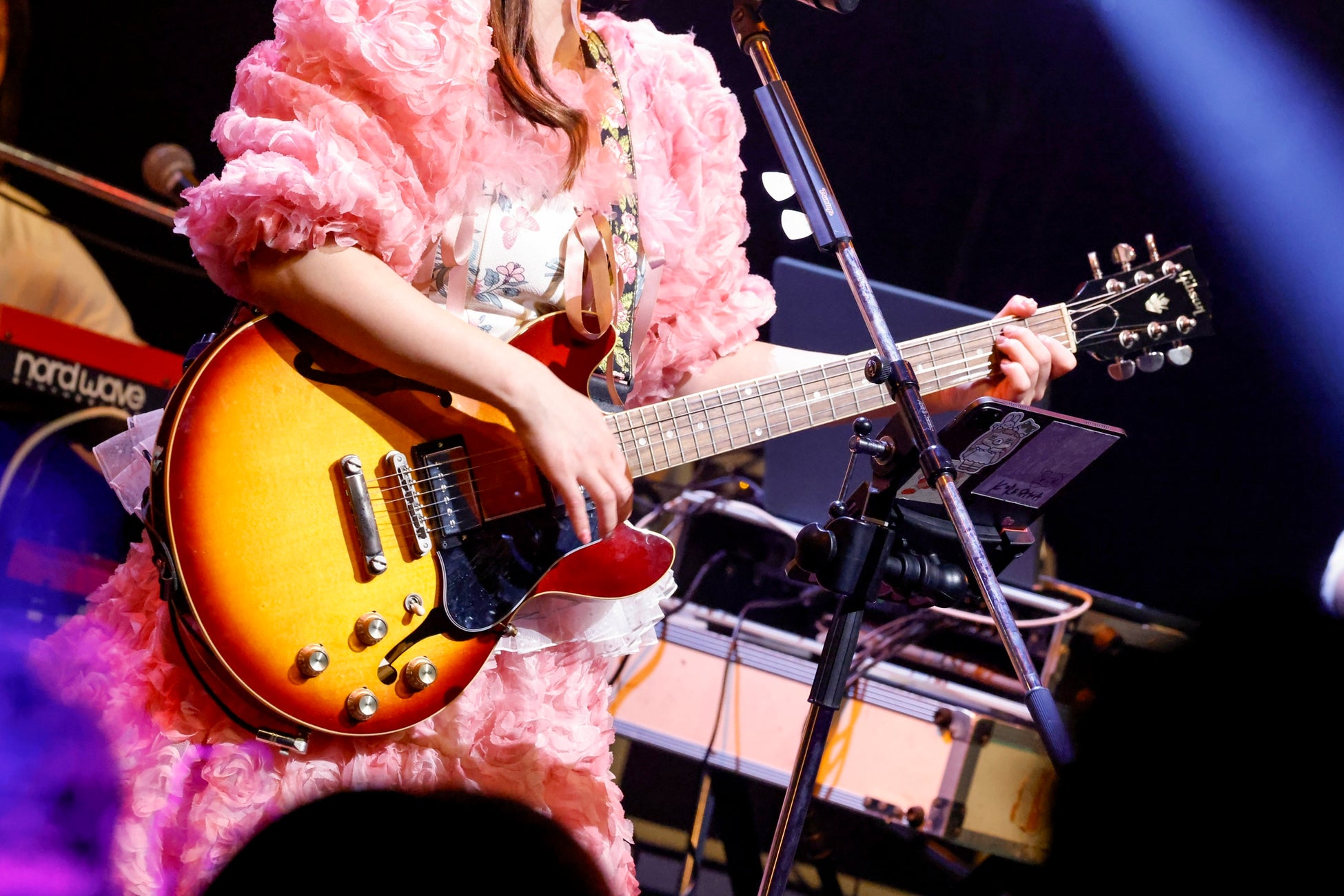 ラジオの放送後は、サポートメンバーのひぐちけい(Gt)、なかむらしょーこ(Ba)、U(Dr)、斎藤渉(Key)に続いて、フリルのセットアップに身を包んだコレサワが登場。デート仕様のキュートな装いで、観客の目を釘付けにする。フロアがペンライトのピンク色の光で包まれたのち「デートの前の夜に」を披露すると、初期からの人気曲「あたしを彼女にしたいなら」を飛び跳ねながらアグレッシブに歌い上げた。