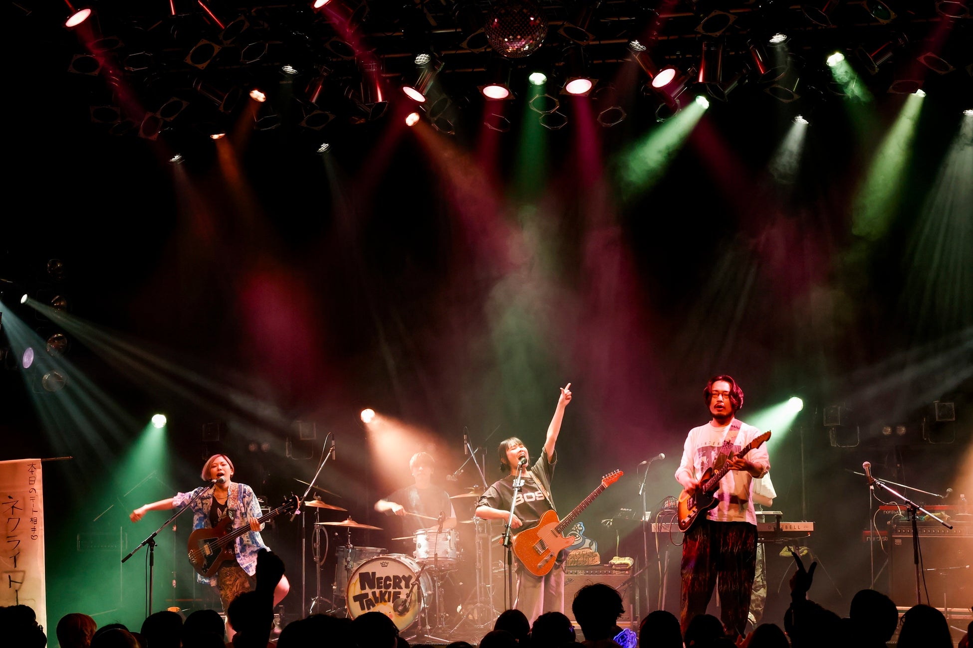 そして牧歌的なナンバー「だけじゃないBABY」、3月26日に発売する2nd EP『モブなりのカンフー』収録の「そういうものでしょう?」に続き、コミカルなナンバー「許せ!服部」へ。ここでもっさが「ゲストボーカル、コレちゃん!」と呼び込み、コレサワがステージに登場。歌詞になぞらえて“借用書”を手にしながら、コール&レスポンスを煽る。さらに、朝日が演奏を止め「我々ネクライトーキーは修行に修行を重ねてまいりましたので、いつ誰が1・2・3・4と言ったとしても、ちゃんと(ブレイクの状態から)演奏に入ることができます。コレサワさんがテキトーなタイミングで1・2・3・4と言っても大丈夫です」と言うと、コレサワは「朝日くん、お金返すねー…1・2・3・4!」など、フェイントを入れながらカウントを連呼。会場を存分に盛り上げ、嵐のように去っていった。