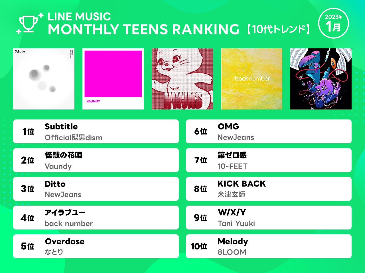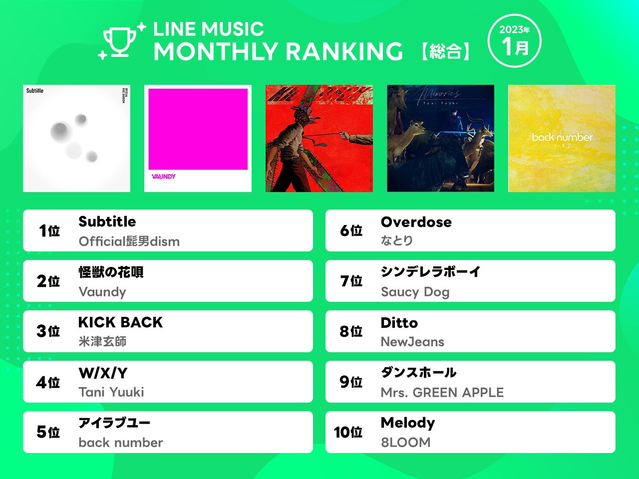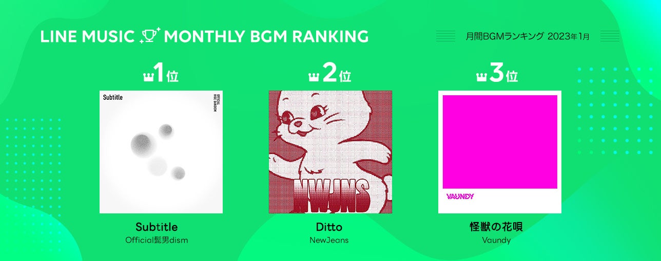 【1月 LINE MUSIC 月間ランキング 】1位Official髭男dism「Subtitle」、2位Vaundy「怪獣の花唄」