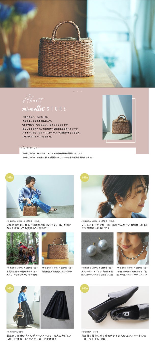 mi-mollet STOREは、「令和の新ベーシック」「お手本はパリマダム」「おばあちゃんになっても愛せる」「新生活は何歳からでもはじめられる」などいくつかのコンセプトのもと、バイイングディレクター福田麻琴氏が厳選した4ブランド、7アイテムでスタート。初年度は、年30点の商品販売を目指して、メディアが運営する唯一無二のコンセプト型ショップの確立を目指します。