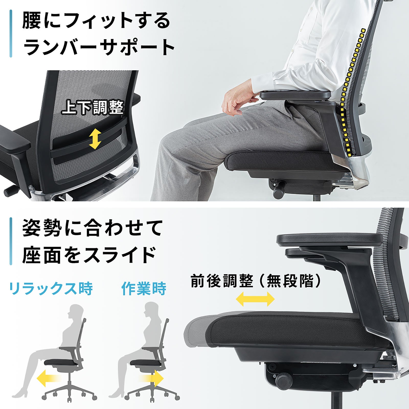 座面は前後にスライドして最適なポジションを確保することが出来ます。上下に位置調整することができるランバーサポート付きです。