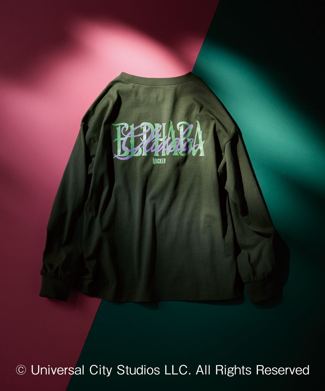 象徴的なグリーンのボディーカラーで作ったロングTシャツ。左胸には、かけがえのないかつての友に、もう一度向き合う姿を。背中には、「エルファバ」と「グリンダ」、ふたりの魔女の名前がからみ合うようにロゴを重ねてプリント。奥行き感と立体感をプラスする背中のラメは、あえて実は光の存在であるエルファバのロゴに入れています。