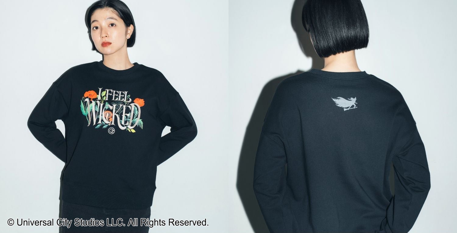 『ウィキッド』の世界観をカジュアルなスウェットで表現。黒地のスウェットに作中の印象的なセリフ「I FEEL WICKED」のアートを大胆に刺しゅうでほどこし、その周りを囲むように鮮やかなポピーの花をプリントした裏毛スウェットです。背面には重力に逆らい空を飛ぶ「エルファバ」の姿をプリント。「ポピーや背面のプリントなど、しっかりと物語の余韻を感じさせるデザインに」とこだわった一着です。