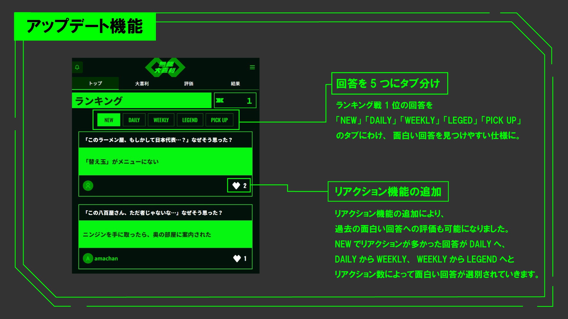 「ランキング」に名称変更を実施し、面白い回答をこれまで以上にわかりやすく、見つけやすくなりました。回答は「NEW・DAILY・WEEKLY・LEGEND・PICKUP」の5つにタブ分けされます。リアクション機能として回答に「いいね」をつけることが可能になり、ユーザーからの「いいね」数に応じて「DAILY・WEEKLY・LEGEND」が選出されます。
