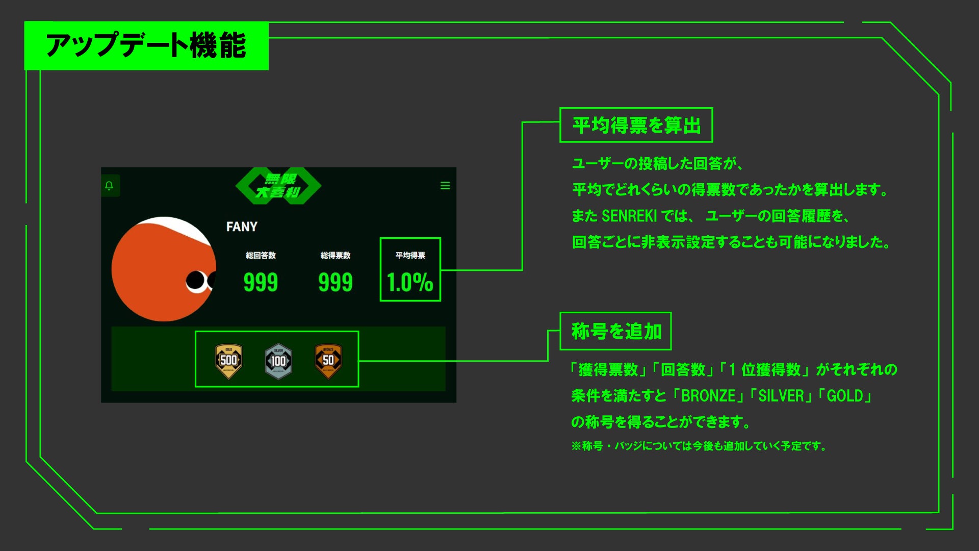 大喜利の回答の「回答数」「獲得票数」「1位獲得数」において、各条件を満たした段階に応じ「BRONZE」「SILVER」「GOLD」の称号を得ることができます。獲得した称号はバッジとして、ユーザーのアイコンに表示されます。称号・バッジについては今後も追加していく予定です。