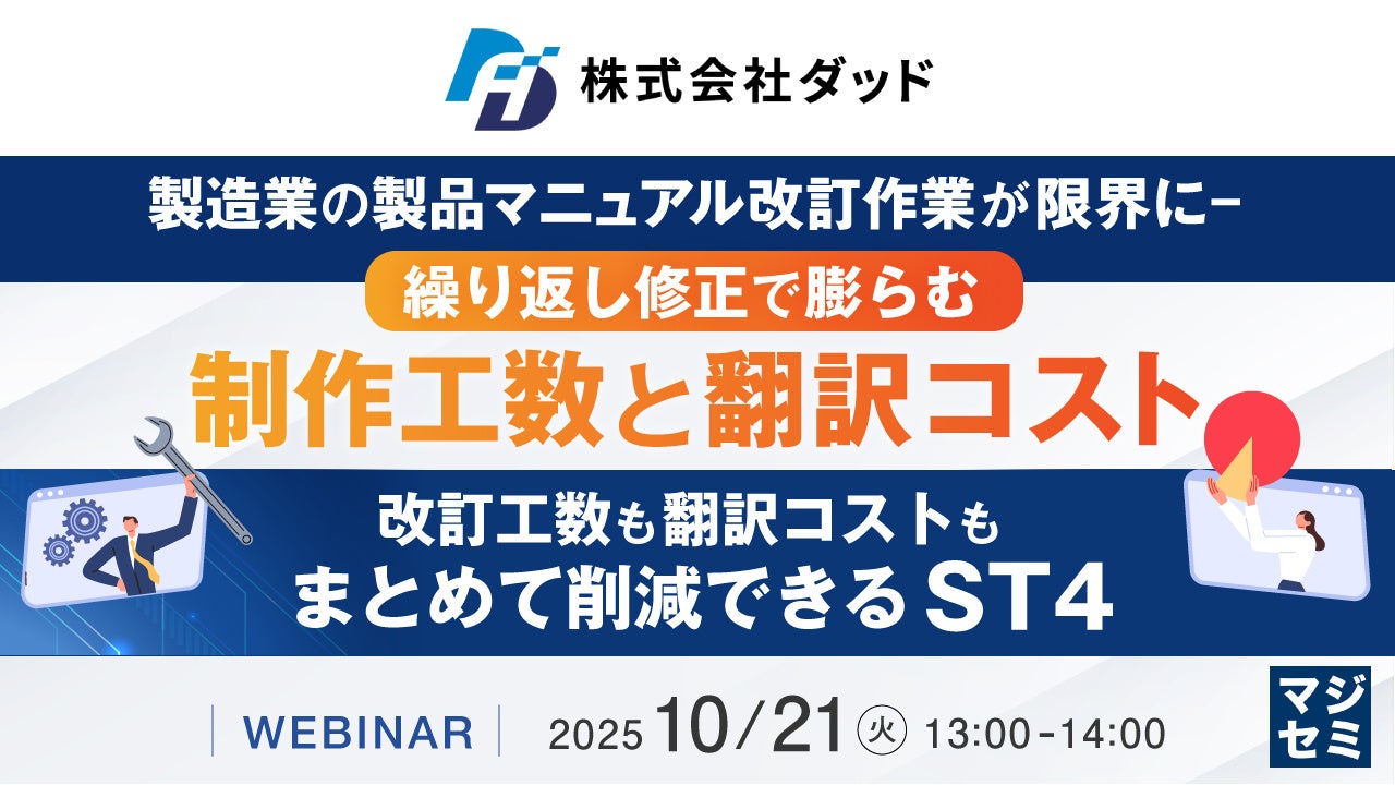 マジセミ株式会社は「製造業の製品マニュアル改訂作業が限界に—繰り返し修正で膨らむ制作工数と翻訳コスト」というテーマのウェビナーを開催します。