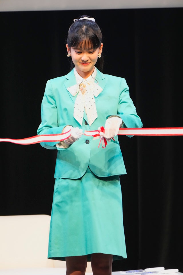緑色のスーツに身を包み、「みなさん、ごきげんよう」と、少しかしこまった雰囲気で登場した大西さん。まずは“オープニングセレモニー”として、彼女自らがハサミを入れる「テープカット」が行なわれた。
