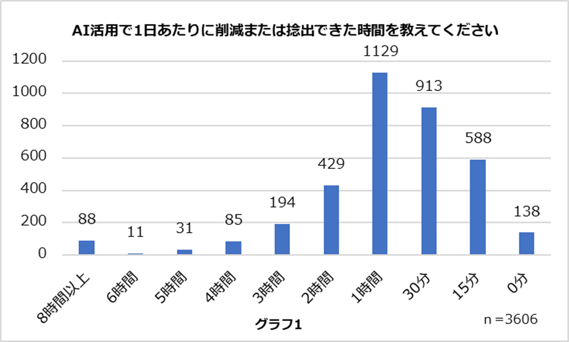 ●生成AIを業務に活用していると回答したパートナーの96%が生成AIの活用により15分/日以上の業務時間を創出したと回答した。1時間/日を創出したパートナーが31%と最も多かった。(グラフ1)