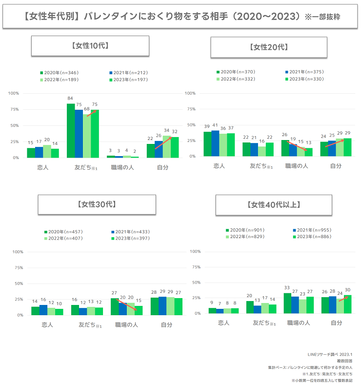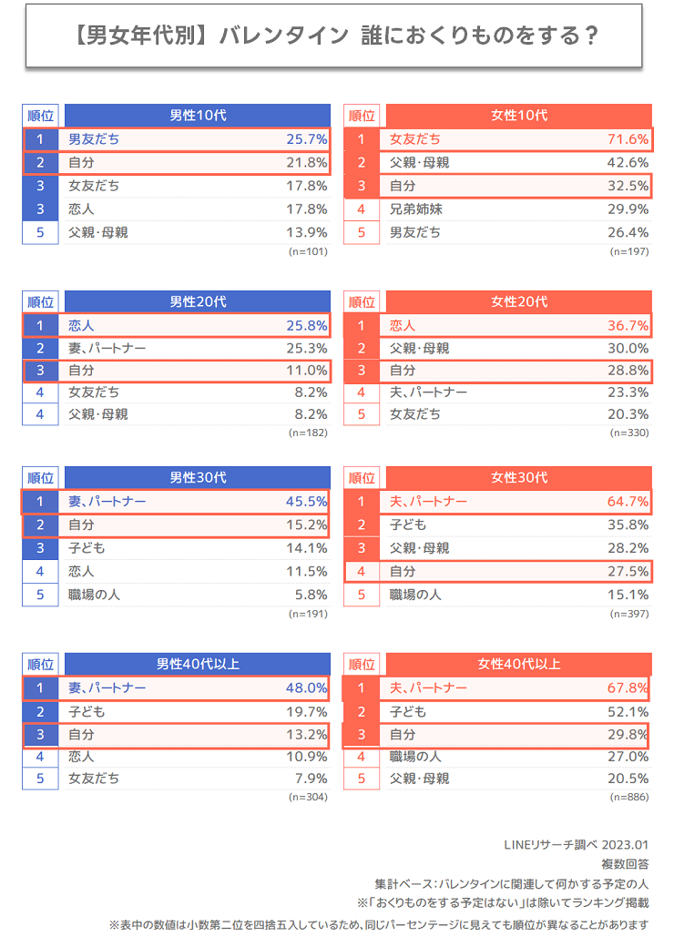 【LINEリサーチ】バレンタインの「おくりものをする相手」は10代で男女ともに「友だち」が1位、すべての年代で「自分」もランクイン