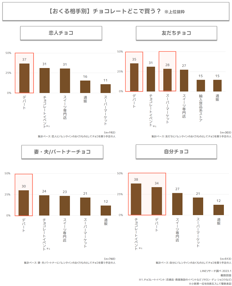 『妻・夫/パートナー』へのチョコも「デパート」がもっとも高くなりました。