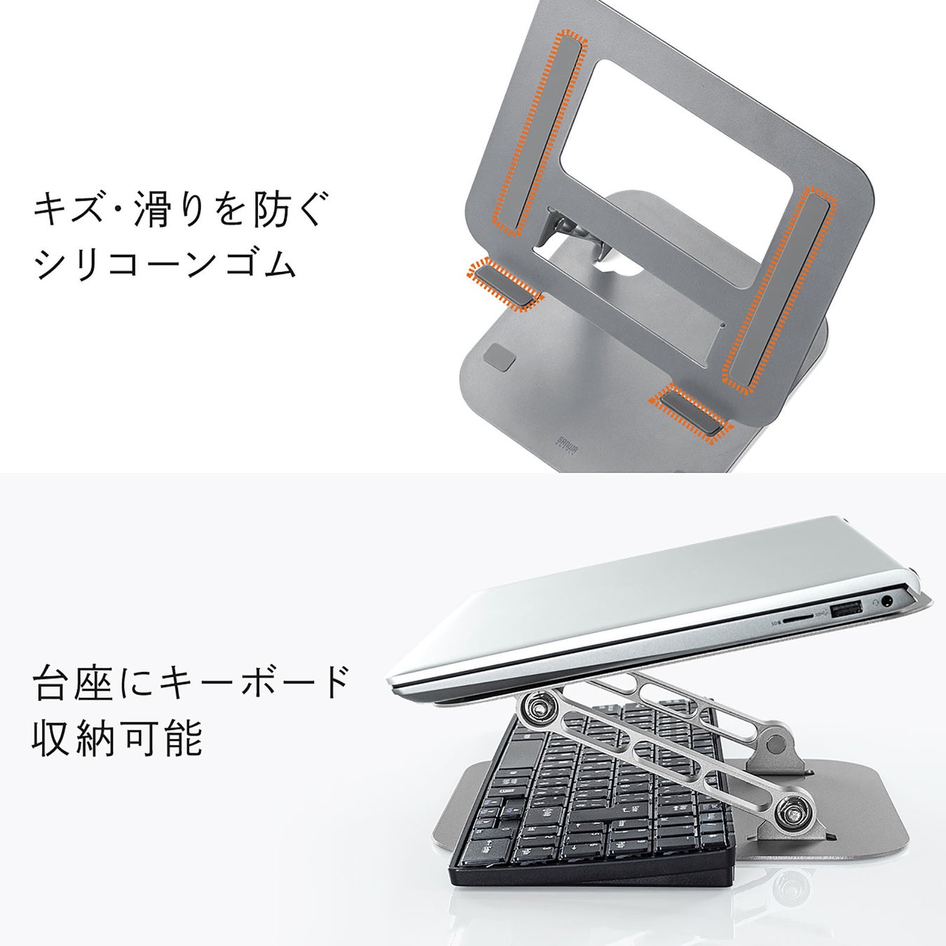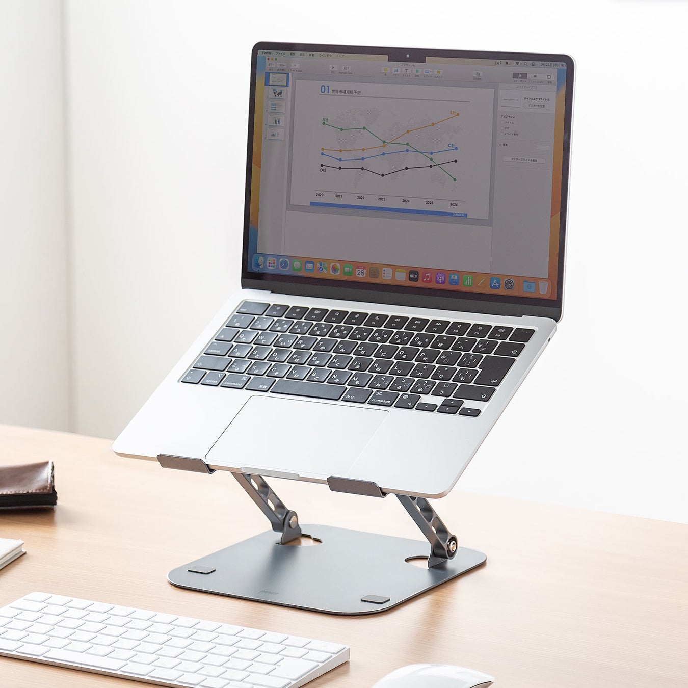 本製品は、角度と高さの調整ができるスチール製のノートパソコン用デスクトップスタンドです。