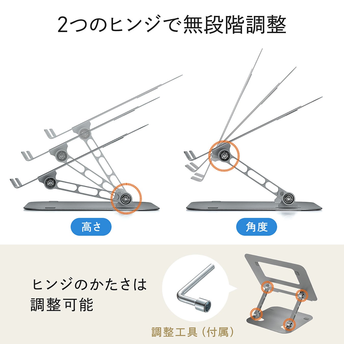 2つのヒンジを搭載し、無段階で自由に角度と高さを調整することができるので、使用環境に合わせて最適な角度で使用できます。