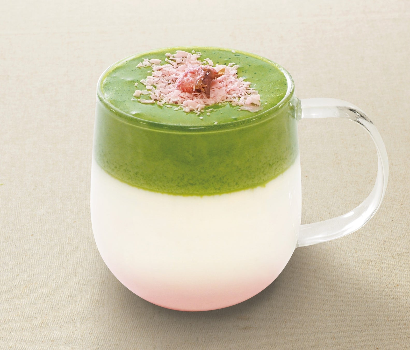 桜の香りと抹茶のほろ苦さを楽しむ優しい味わいのホットドリンク