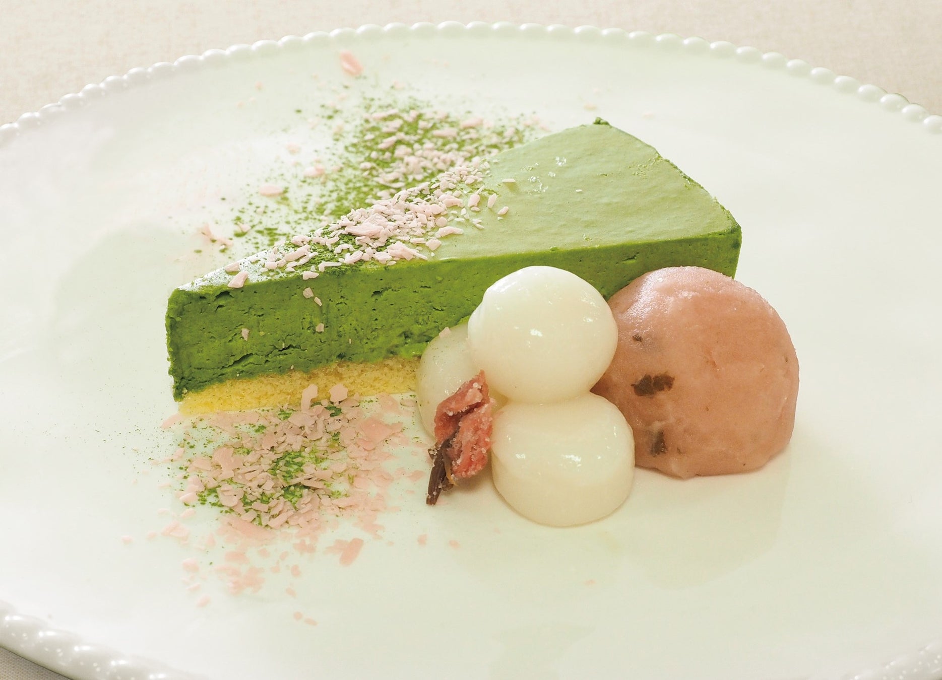 祇園辻利の抹茶粉を使用した冷たい抹茶ケーキに桜餡、白玉を添え、桜チェコを散らし桜の花が風に舞うような仕立てにすることで目でも楽しめます。