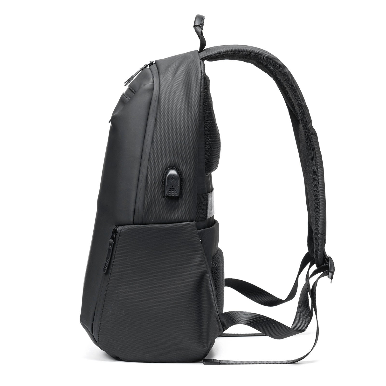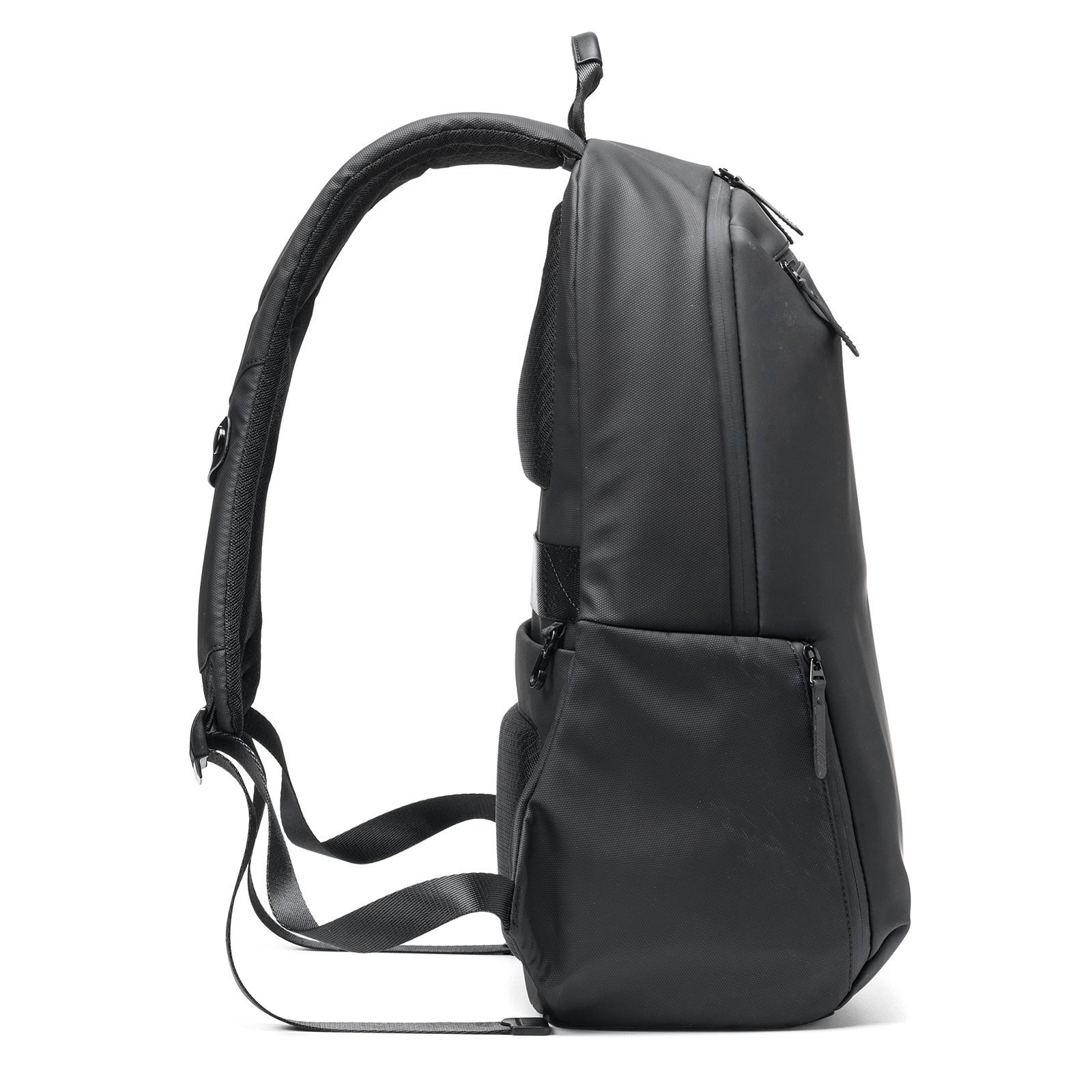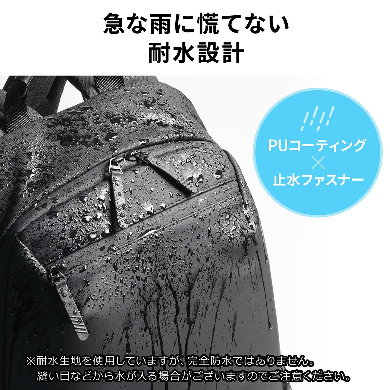外装には水の侵入を防ぐPUコーティング生地と止水ファスナーを使用しています。雨の日も安心して持ち運べます。