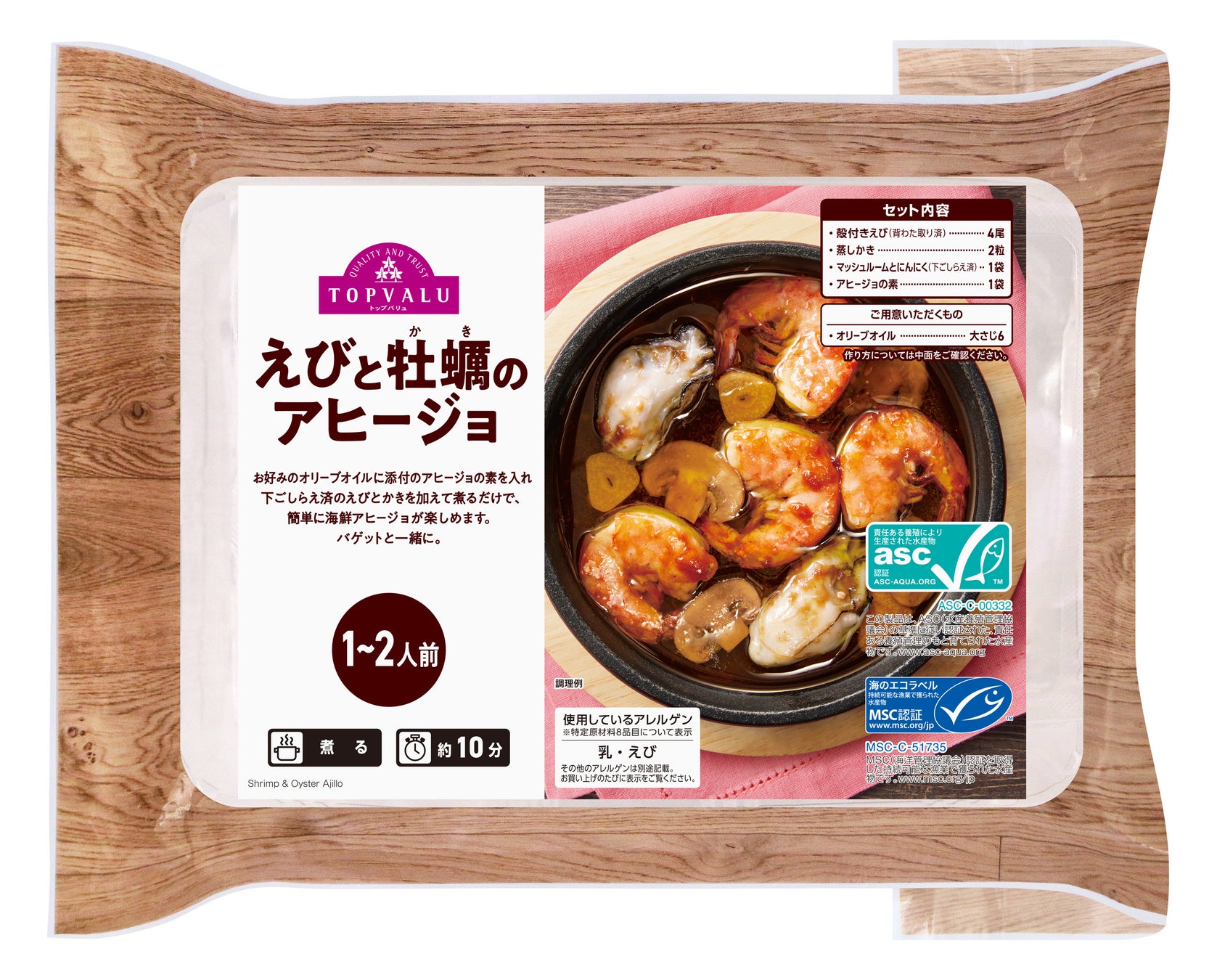 特長:ベトナム産ASC認証のバナメイえび、岡山県産MSC認証の蒸し牡蠣を使っています。オリーブオイルとアヒージョの素を混ぜて、えびと牡蠣を煮込めば簡単にアヒージョができ上がります。食べ終わった後のオイルはバゲットに付けて食べるとおいしくお召し上がりいただけます。
