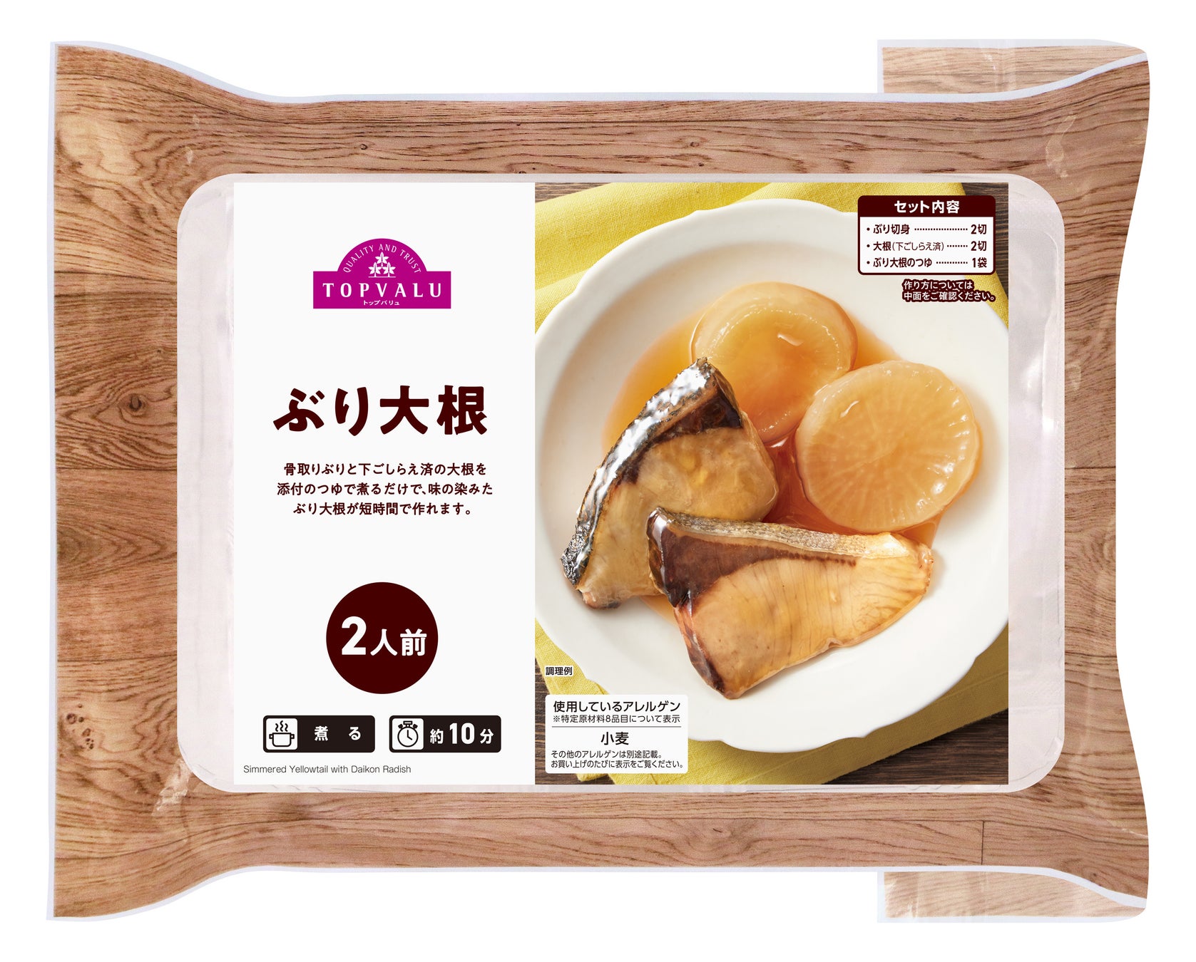 特長:ぶりの切身と大根とたれをセットにした商品。大根は下ごしらえ済で、約10分でぶり大根をお召し上がりいただけます。