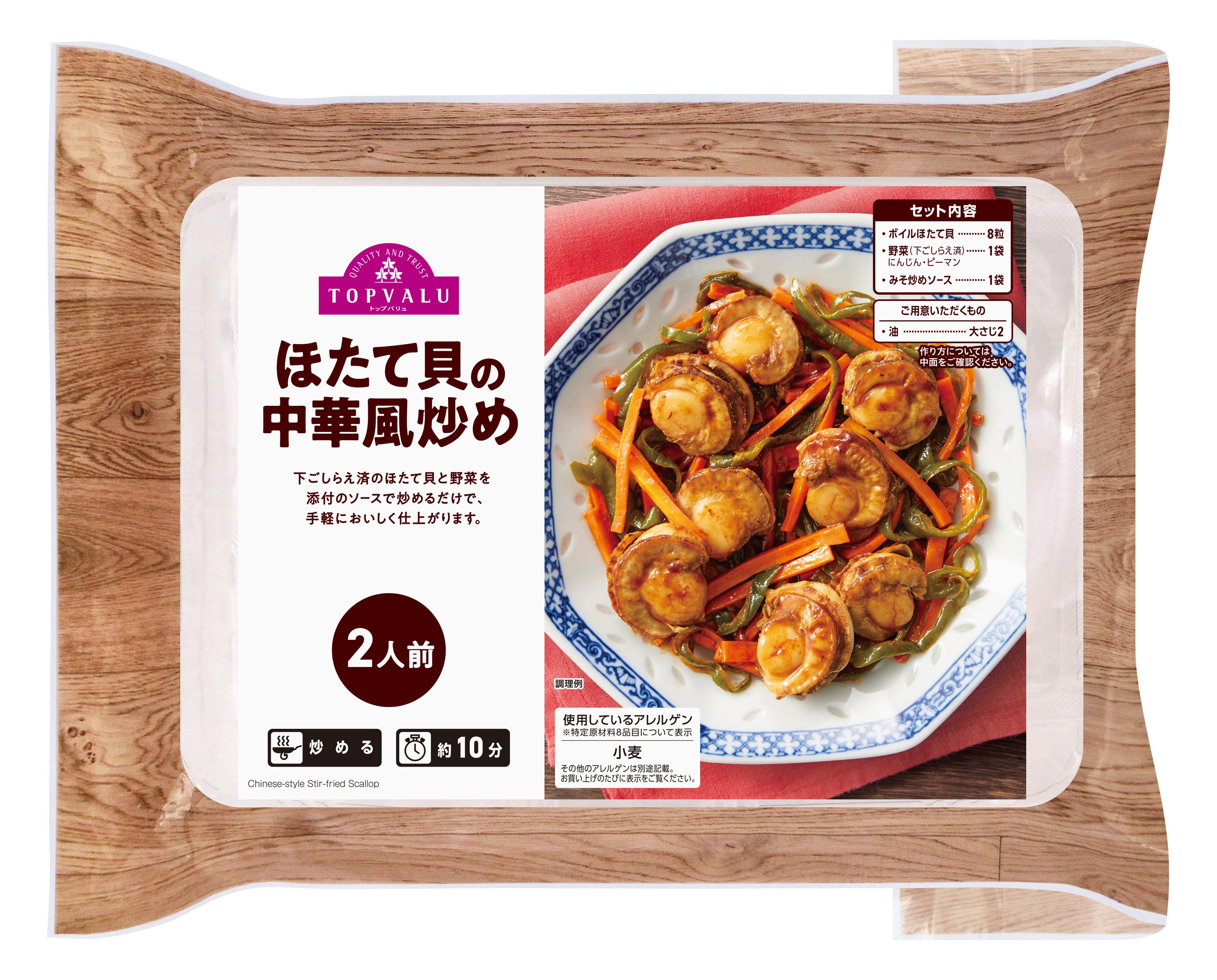 特長:北海道産のボイルほたて貝と下ごしらえ済の人参・ピーマンを味噌ベースのソースで炒めることで、約10分で中華風の炒め物ができ上がります。