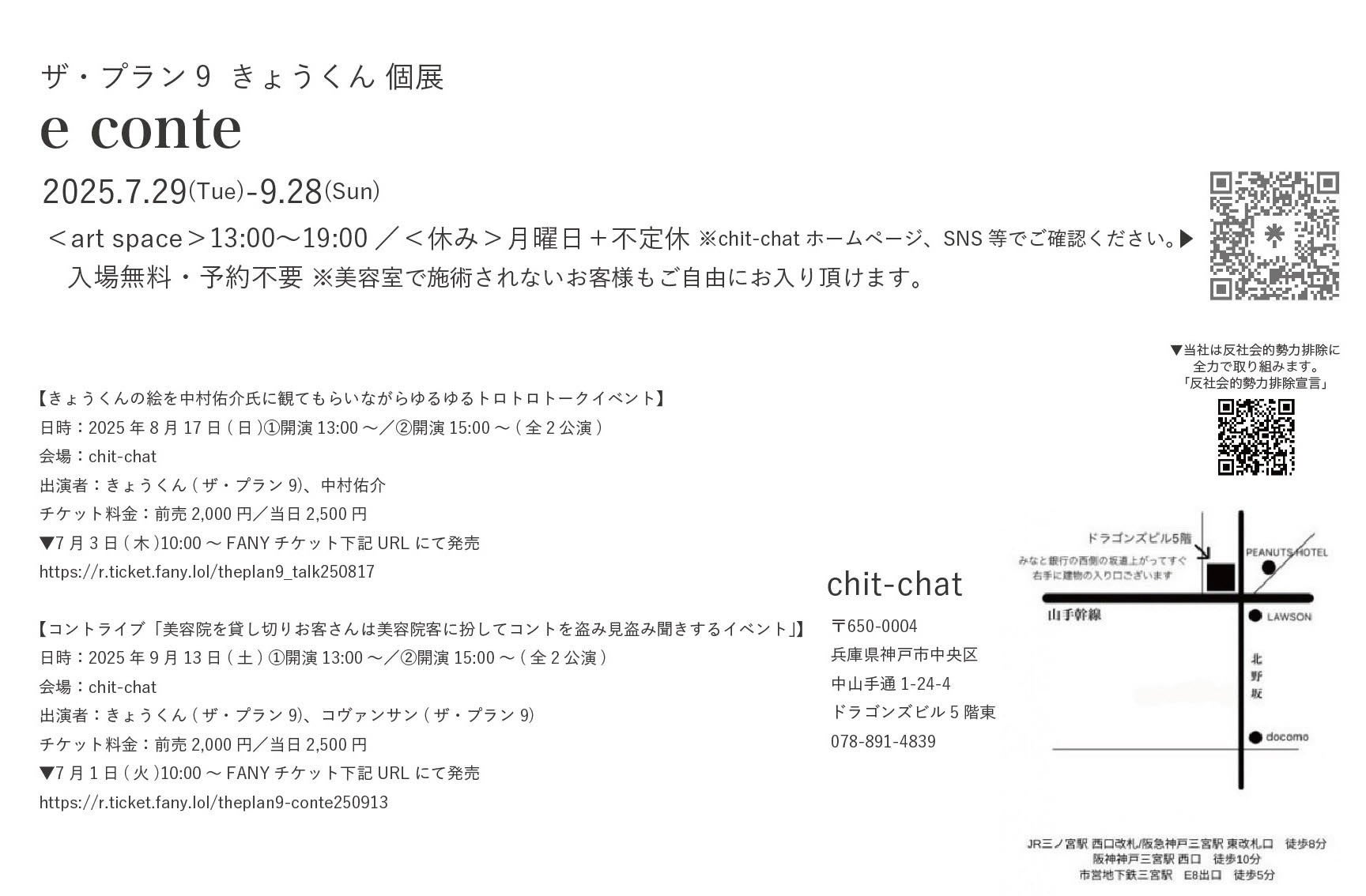 この度、 2025年7月29日(火)~9月28日(日)の期間、兵庫県三ノ宮の美容院 chit-chatにて、ザ・プラン9 きょうくん初となる個展 「e conte」を開催いたします。
