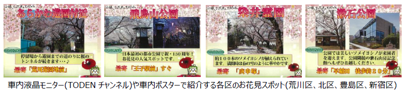 車内に桜をモチーフとしたステッカー装飾を施すとともに、車両前面に東京さくらトラムのマスコットキャラクター「とあらん」をあしらったヘッドマークを装着します。また、車内液晶モニター(TODENチャンネル)や車内ポスターで、各区のお花見スポットやお花見イベント等を紹介します。