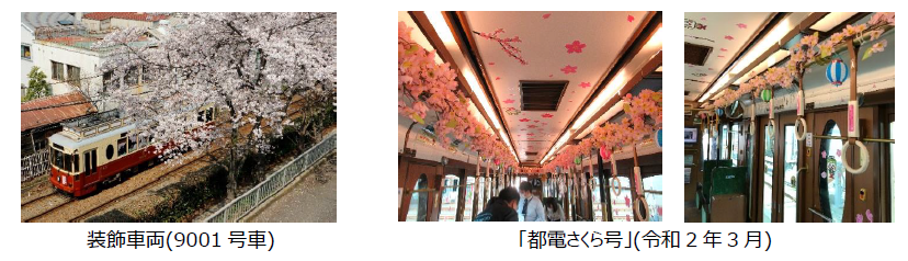 「都電さくら号」は、東京さくらトラム(都電荒川線)の沿線4区(荒川区、北区、豊島区、新宿区)と連携して、9001号車(赤いレトロ車両)の車内に桜をモチーフとしたステッカー装飾を施すとともに、車両前面にヘッドマークを装着し、乗車したお客様や沿線の方々に春の訪れをお届けいたします。