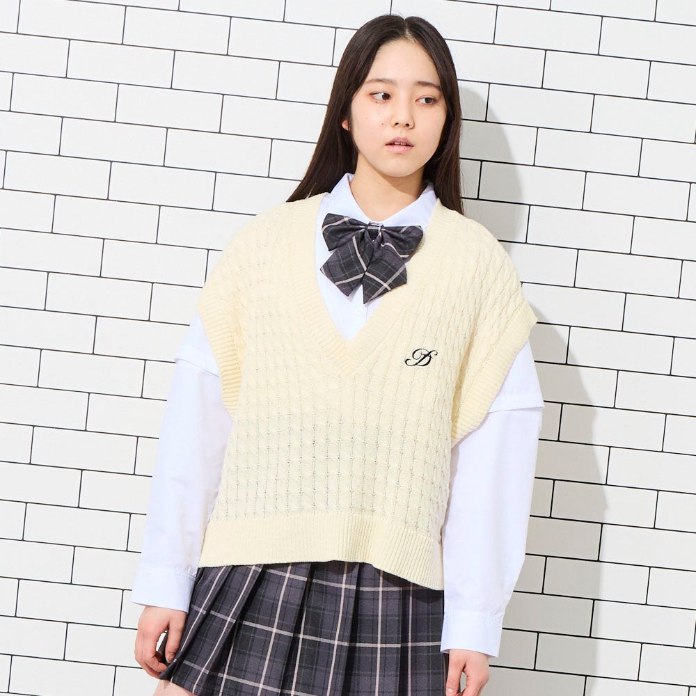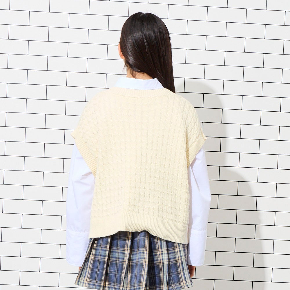 胸にダブルフォーカスのワンポイント刺繍を使用しています。ブラウスに合わせやすい短丈のケーブル柄ベストです。