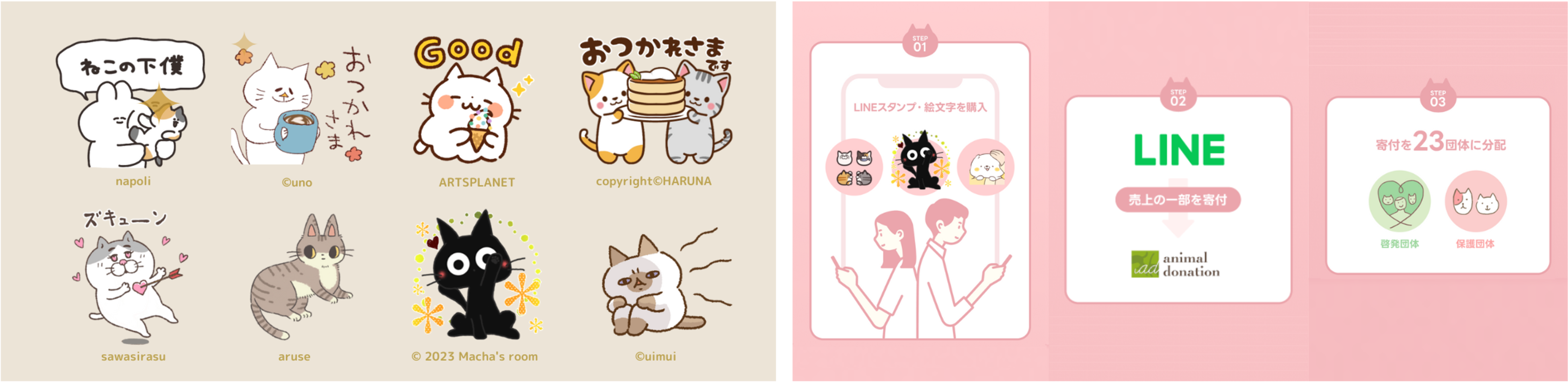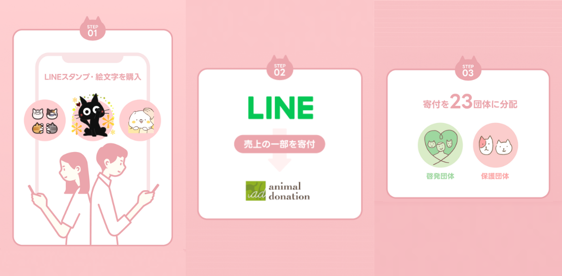 スタンプ・絵文字の売上の一部(※)は、23の動物福祉活動団体と寄付を通じて支援したい人をつなぐ「公益社団法人 アニマル・ドネーション」に寄付され、猫たちが幸せに暮らすことができる社会づくりに役立てられます。