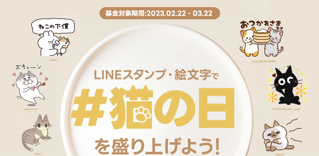 第二回目となる今年は、LINEスタンプに加えて絵文字の購入も寄付の対象にひろげ、2023年2月22日の「猫の日」より「LINEスタンプ・絵文字で #猫の日 を盛り上げよう!キャンペーン」を開催いたします。