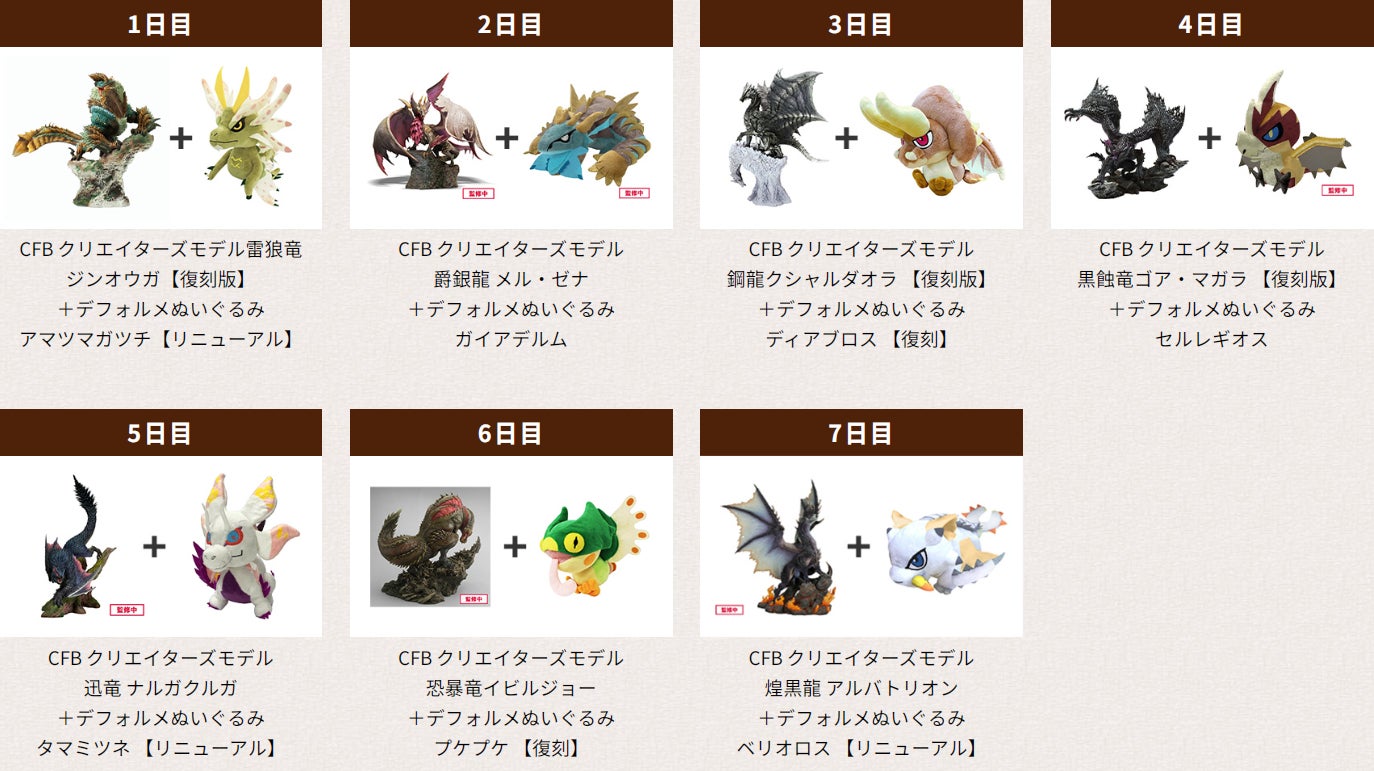 期間中毎日抽選で1名様、計7名様に「カプコンフィギュアビルダー クリエイターズモデル」と「モンスターハンター デフォルメぬいぐるみ」のセットをプレゼント! 期間中は毎日賞品の組み合わせが変わる!