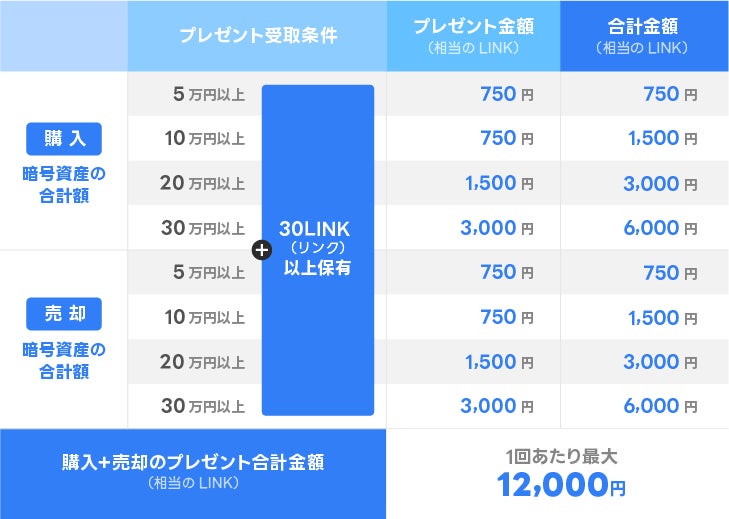 このたび、30LINK以上の保有と各暗号資産の購入または売却合計額が50,000円以上の方を対象に、最大12,000円相当の「LINK」を20日間連続でプレゼントする「20日間連続プレゼントキャンペーン」を開催いたします。