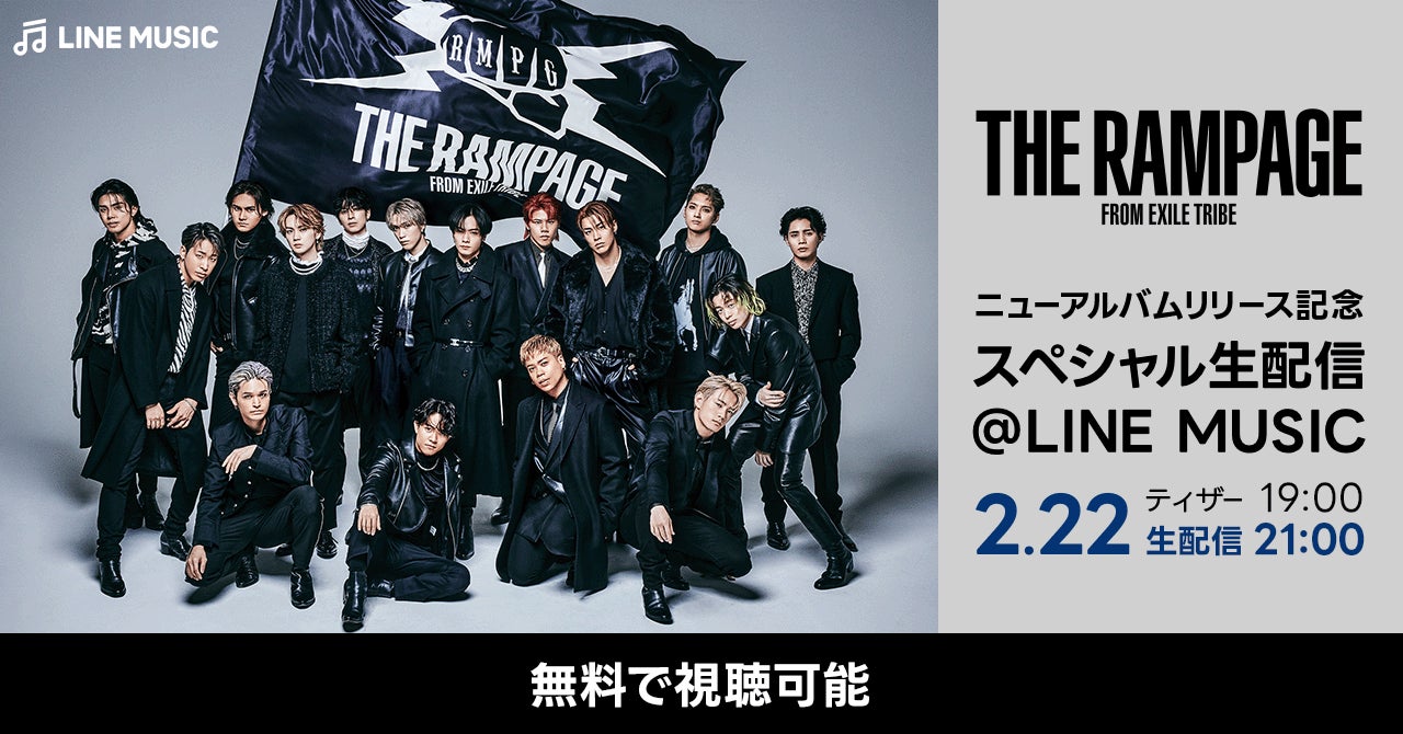 LINE MUSIC株式会社は、当社が運営する音楽ストリーミングサービス「LINE MUSIC」(iPhone・Android対応)において、16人組ダンス&ボーカルグループTHE RAMPAGE from EXILE TRIBEが出演する「THE RAMPAGE ニューアルバム記念 スペシャル生配信@LINE MUSIC」を配信することをお知らせいたします。