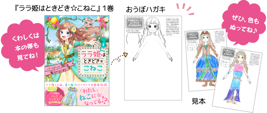 小学生向け児童書新シリーズ『ララ姫はときどき☆こねこ』1巻では、2022年7月14日から“ララ姫のドレスコンテスト”を開催しています。お話の主人公のドレスをデザインして、応募する企画です。