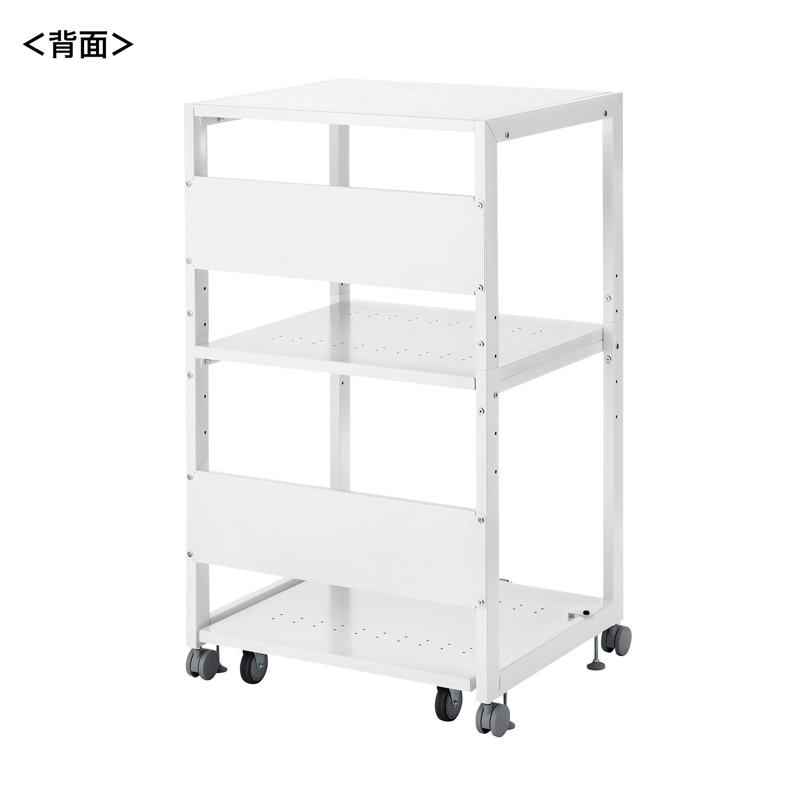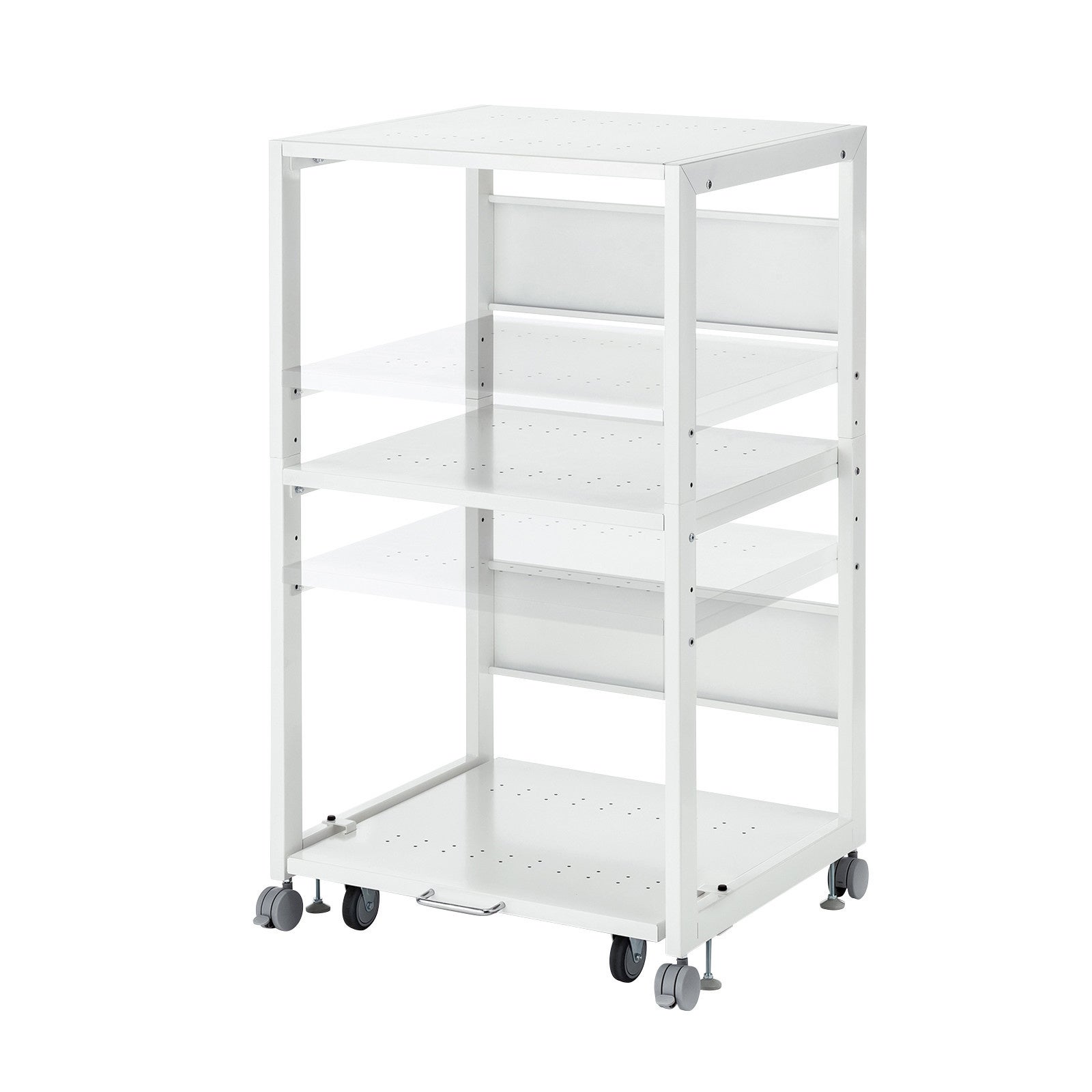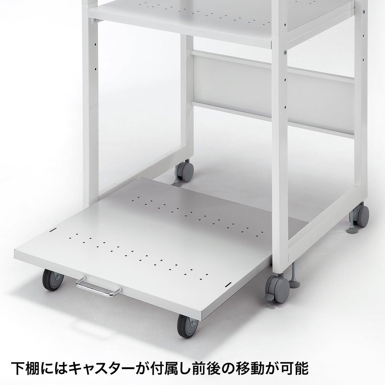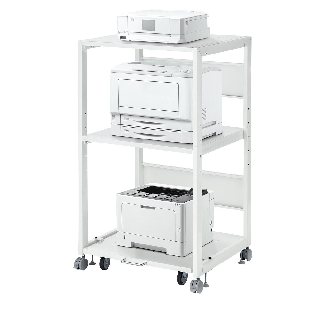 中棚は5段階で高さを調整でき、設置するプリンタや機器に合わせて変更できます。下棚はキャスター付きでスライド棚になっており、必要な時だけ棚を引き出して使うことができます。