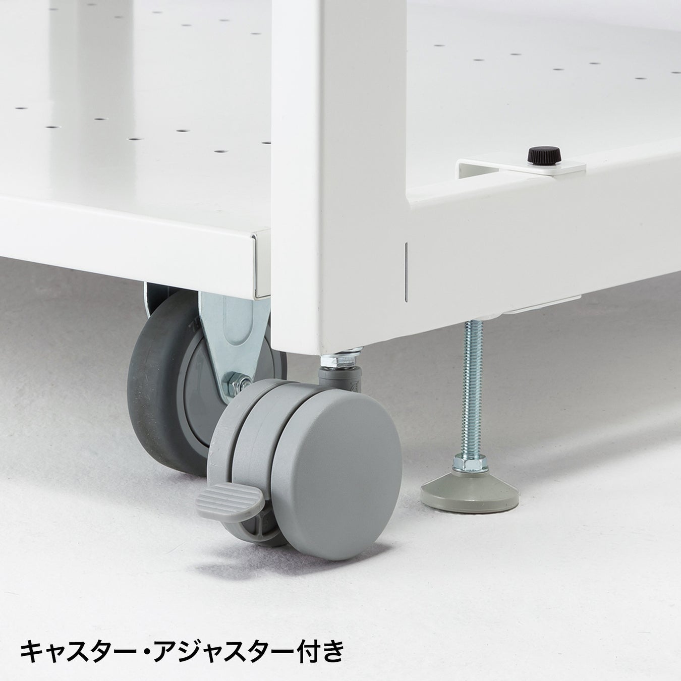 便利なキャスター付きなので、ちょっとした移動やメンテナンス作業がしやすくなっています。前方のキャスターにはストッパーが付いているため不意に動き出す心配がありません。アジャスターもついており、高さを微調整でき、ガタツキを防止できます。