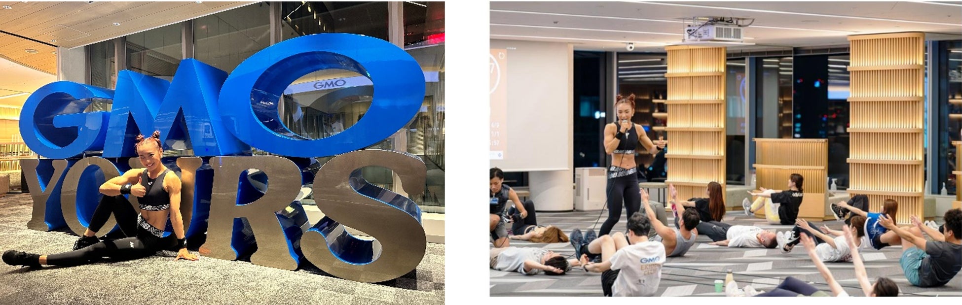 外部の専門インストラクターを招き、社員向けにフィットネスレッスンやヨガクラスを開催。パートナーの健康維持とリフレッシュのための機会を提供。2023年9月には、フィットネスプロデューサーのAYAさんを本社に招きコミュニケーションスペースGMO Yours・フクラス(カフェ)でフィットネストレーニングを実施。