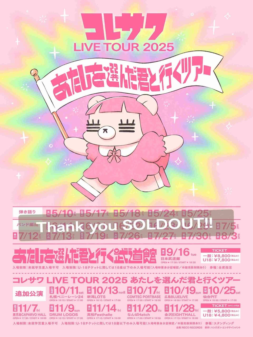 さらに、コレサワは本日開催された『あたしを選んだ君とあたしを選ばなかった君へ』リリース記念生配信内で、全会場SOLD OUTとなっていた「コレサワ LIVE TOUR 2025 あたしを選んだ君と行くツアー」の追加公演を開催することを発表。