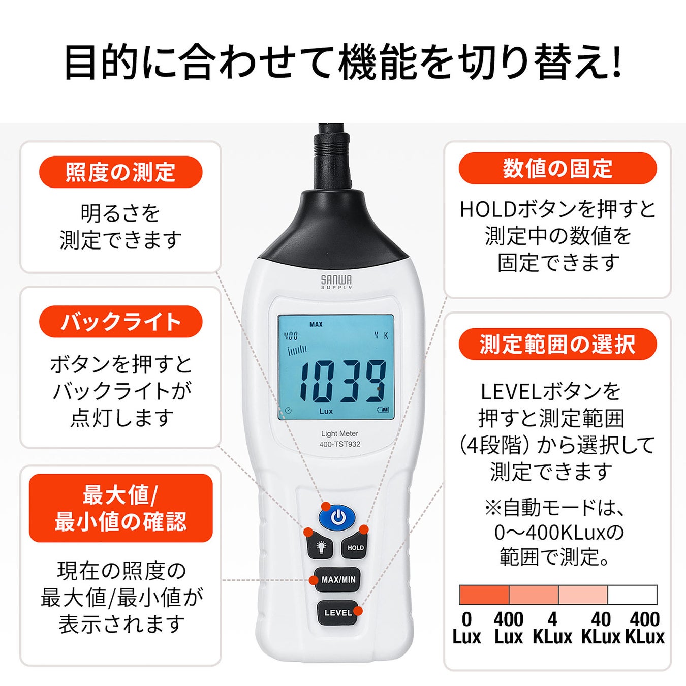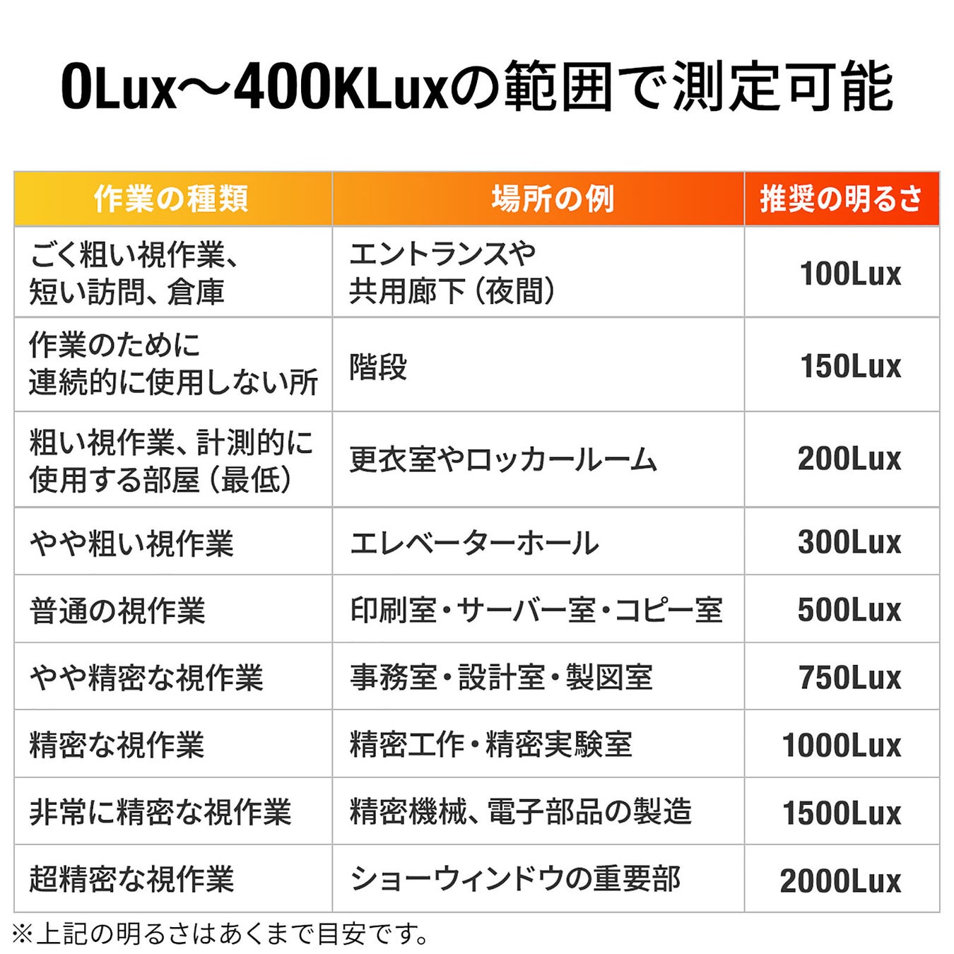 住居、事務所、学校、図書館、美術館、工場など、多くの場所で使用でき、0~400KLuxの幅広い範囲で測定が可能です。