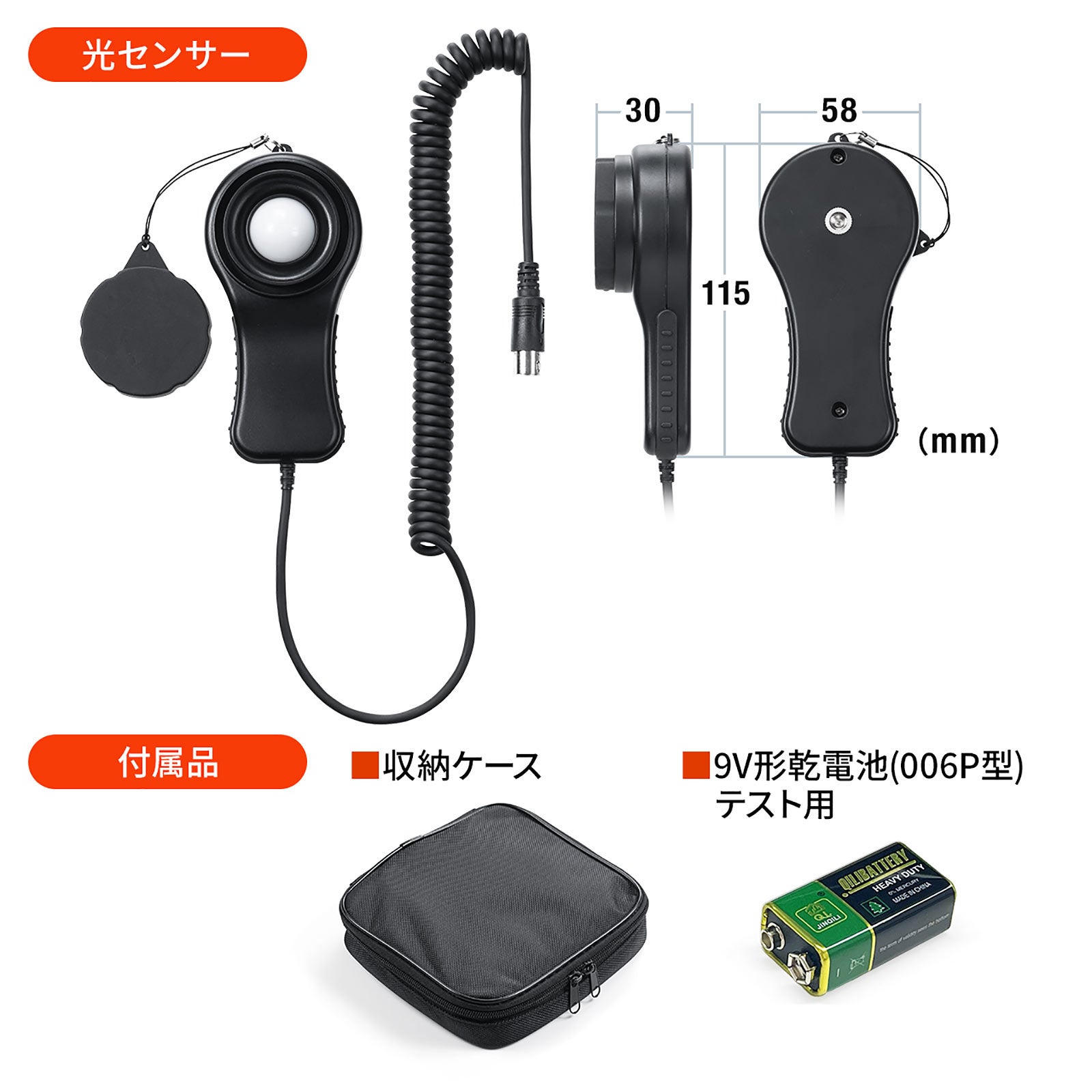 本製品のサイズはデジタル照度計:約W62×D32×H158mm、光センサー:約W58×D30×H115mm、 重量は約258gです。