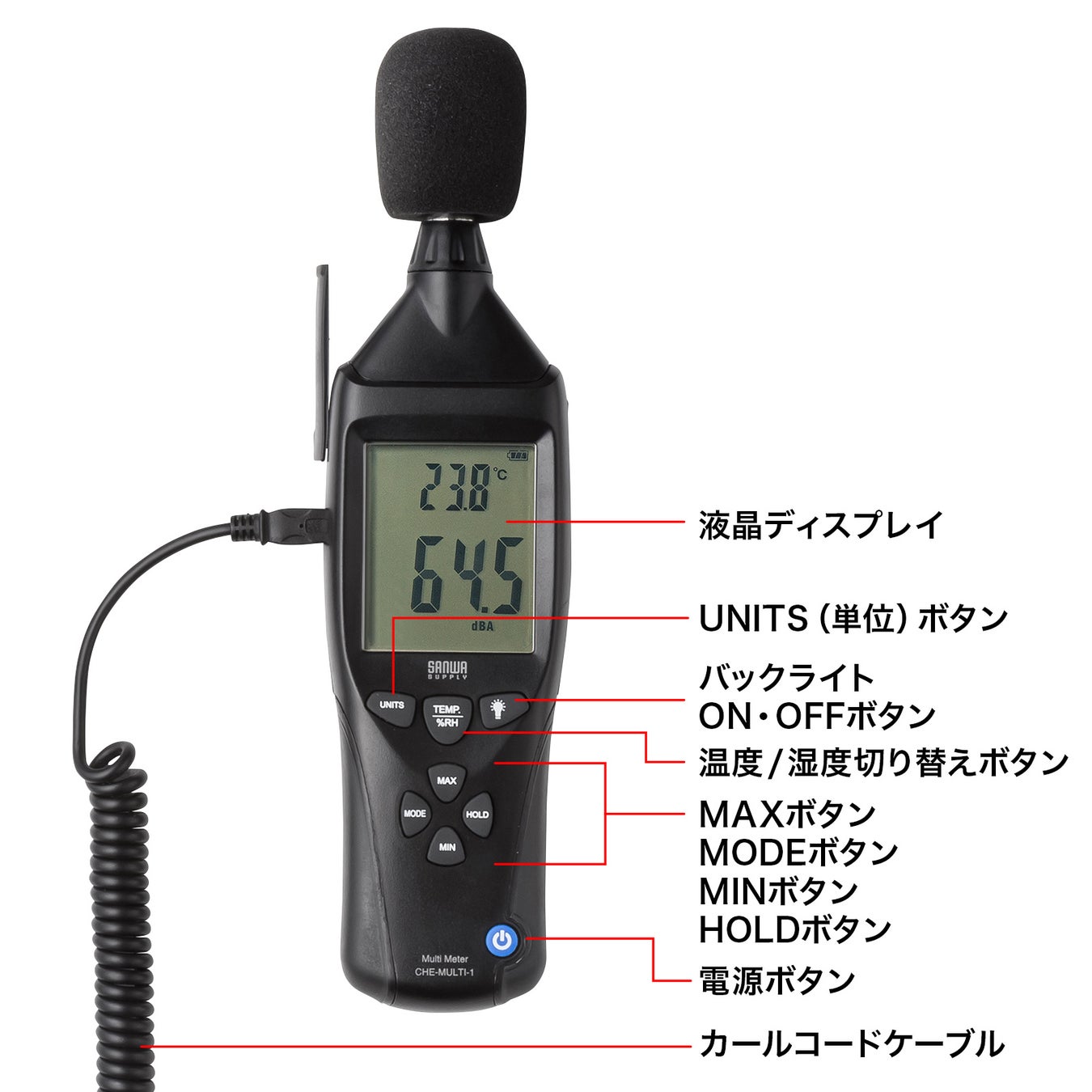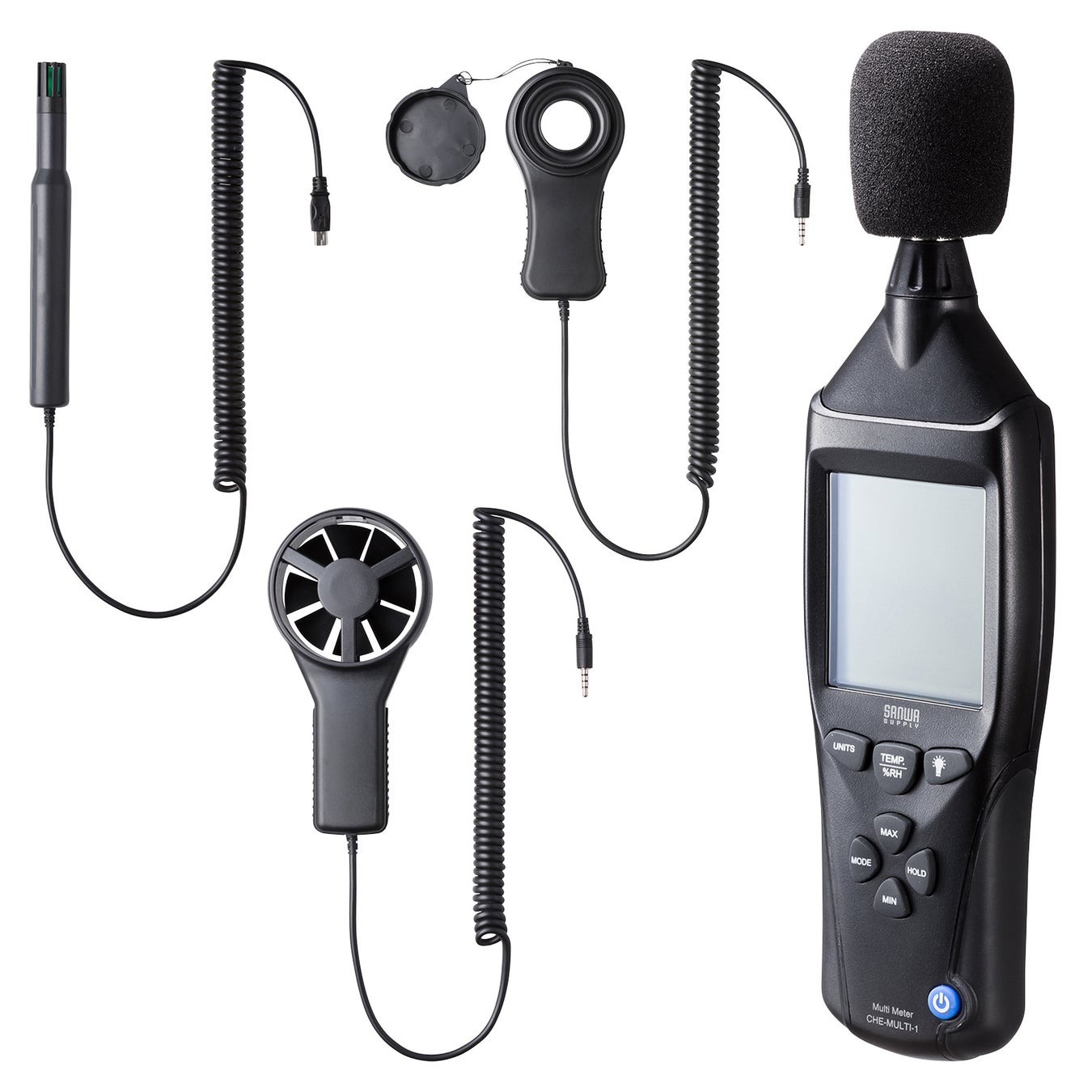 「CHE-MULTI-1」は、騒音、風速、照度、温度、湿度を測定可能な測定器です。1台に各種測定用センサーを搭載し、本製品1つで様々な環境を計測できます。簡単操作で、測定結果が見やすいデジタル表示です。