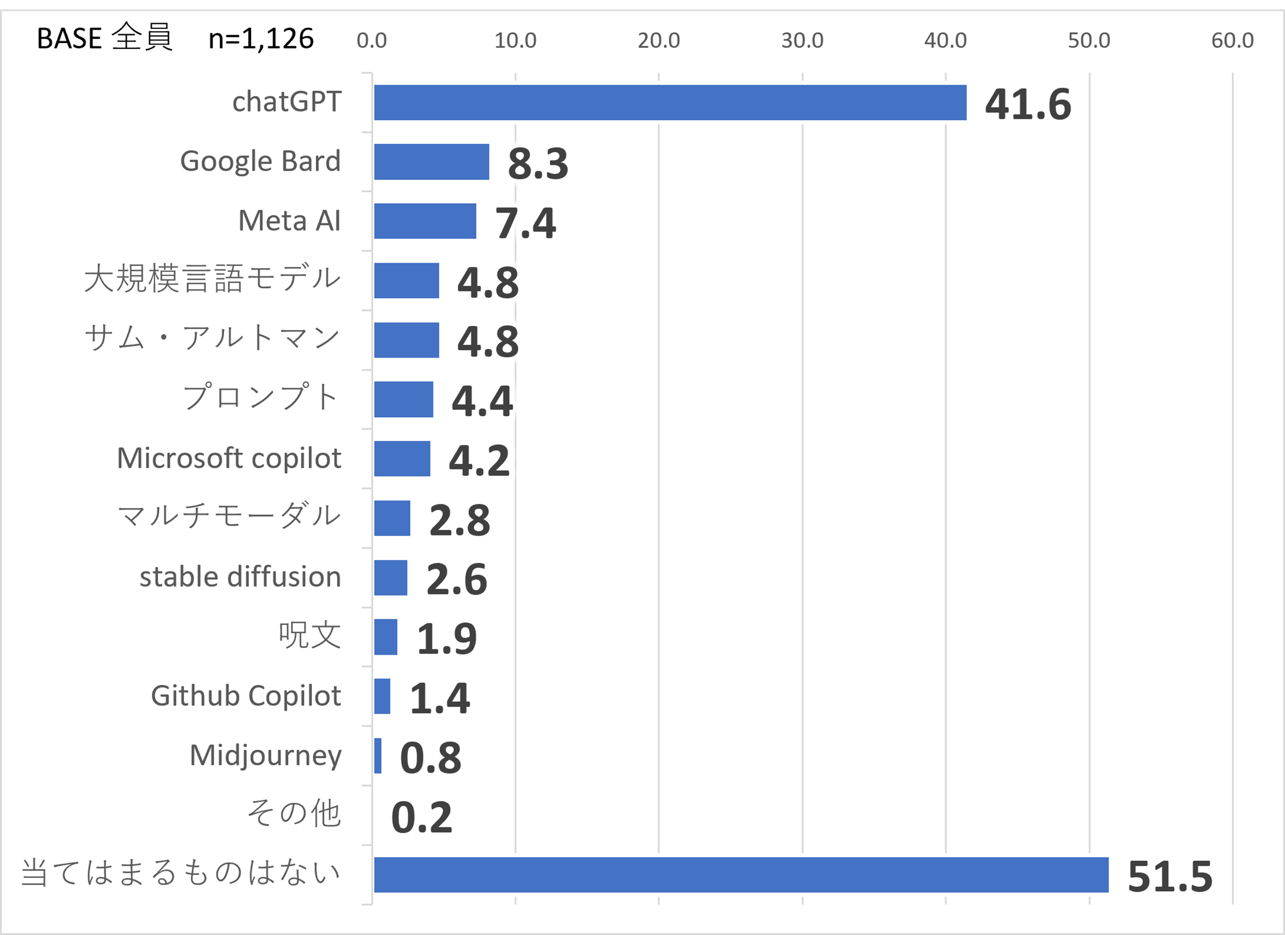 特に回答が多かったのは「ChatGPT」で41.6%を占め、2位以降と30ポイント以上差が開くなど、生成AIの代名詞として圧倒的に認知されていることを示しています。