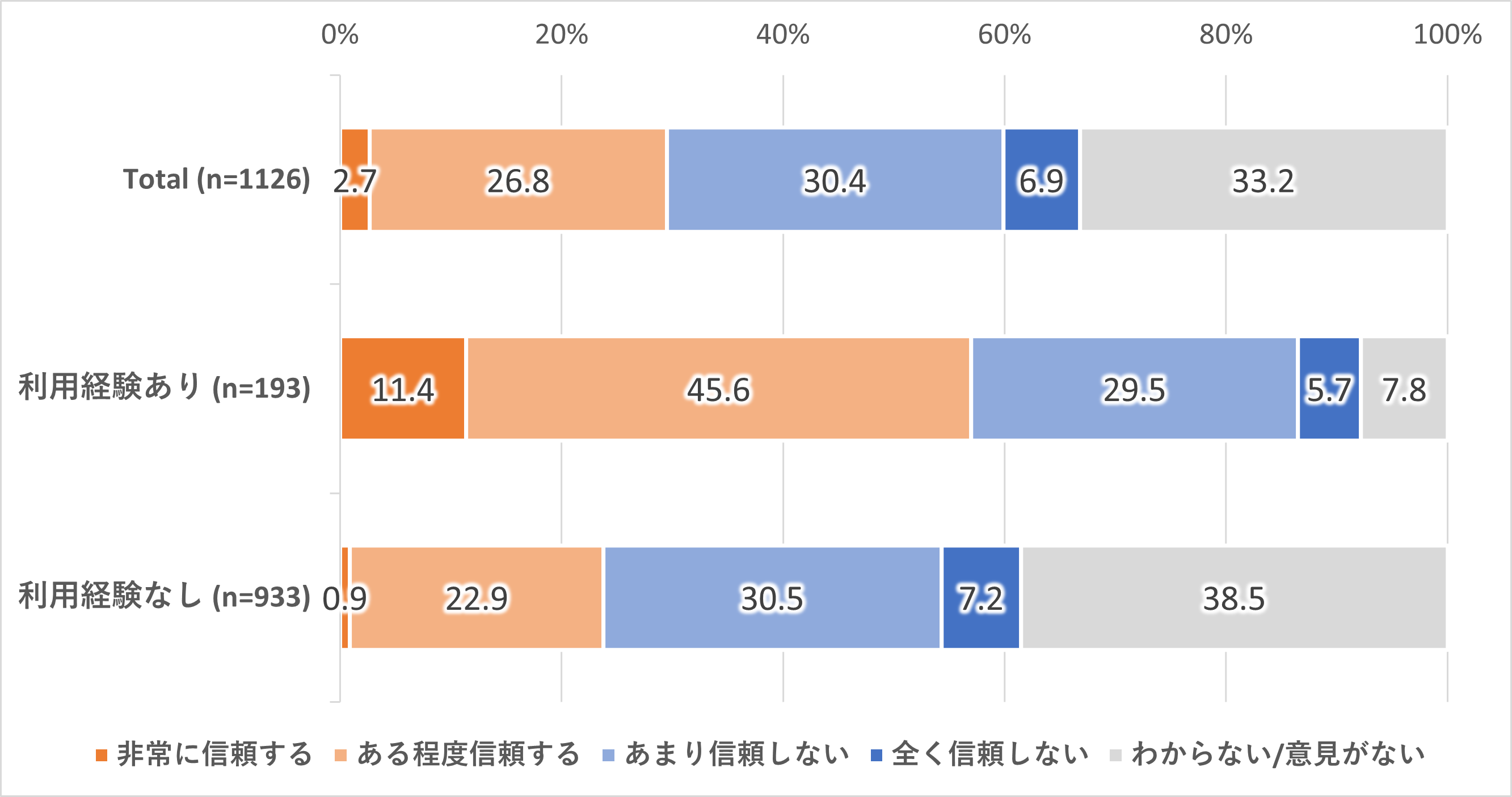 生成AIの利用経験の有無別にみると、利用経験者で信頼すると答えた人が57.0%、未利用者は23.8%と33.2ポイントの差がありました。一方で、信頼しないと答えた人の合計は、未利用者(37.7%)と利用経験者(35.2%)で大きな差はない結果となりました。さらに、わからない/意見がないと回答した人は利用経験者が7.8%、未利用者が38.5%と、30.7ポイントの差がありました。