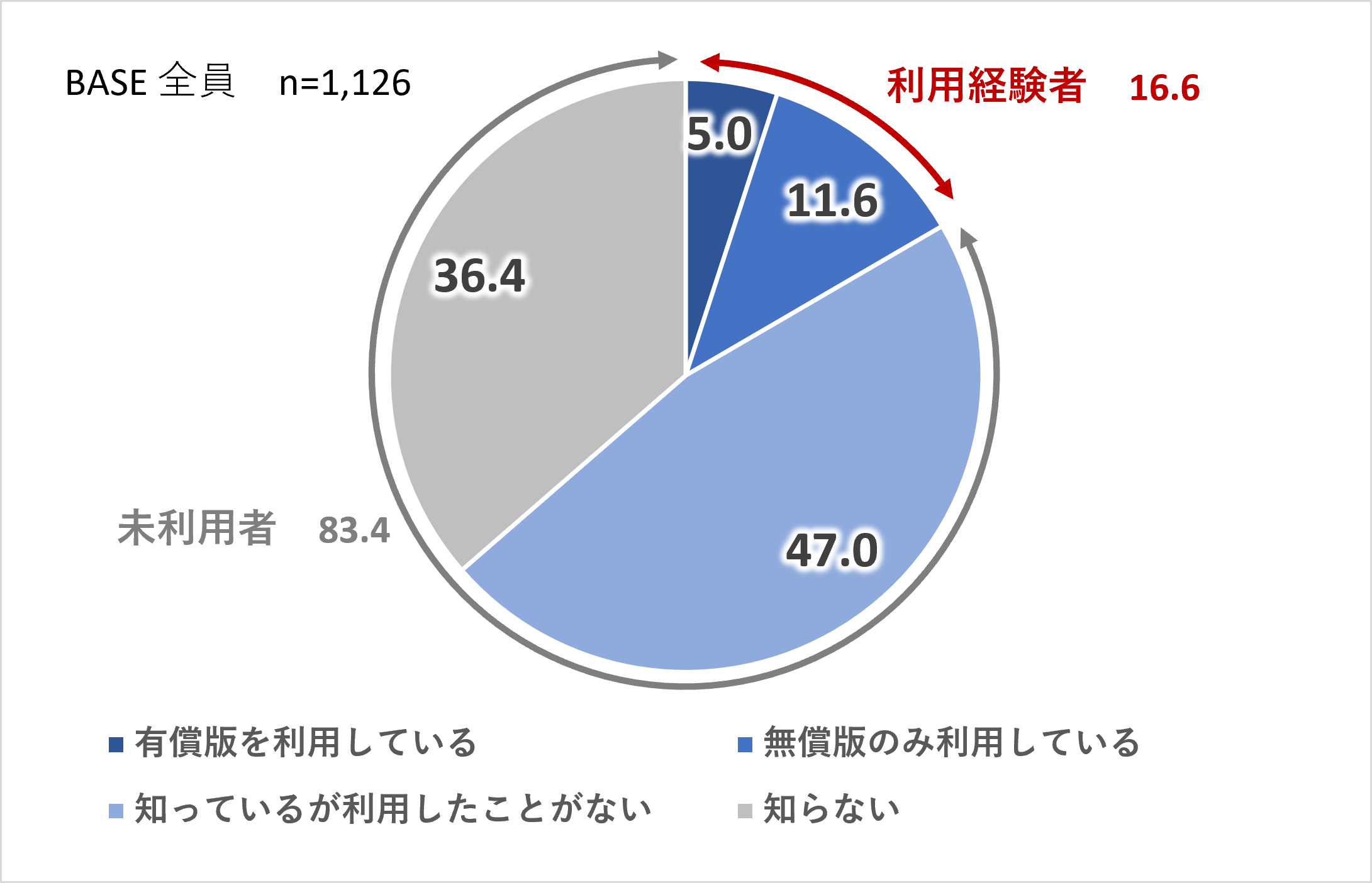一方、利用したことがある人(有償版を利用している・無償版を利用している)は16.6%にとどまり、生成AIについて知っていても利用していないという人のほうが47.0%と圧倒的に多いことが分かりました。