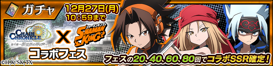 SSR「シャーマンキングを目指す少年 麻倉 葉」をはじめとする、『SHAMAN KING』コラボキャラクターが登場するコラボフェス第1弾を開催!SSR以上は必ずコラボキャラクターが登場します。