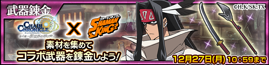 TVアニメ『SHAMAN KING』とのコラボイベントに合わせて、コラボ武器を錬金できる専用素材が期間限定で登場!コラボイベント期間中、クエストやイベント探索などで専用素材やコラボ武器を獲得できます。