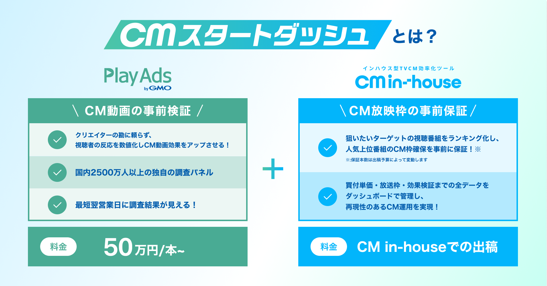 『CMスタートダッシュ』は、完成前にCM動画のクリエイティブを評価できる、動画検証ツールである「PlayAds byGMO」と、TVCMをインハウス型で購入できる「CM in-house」を組み合わせたパッケージプランです。